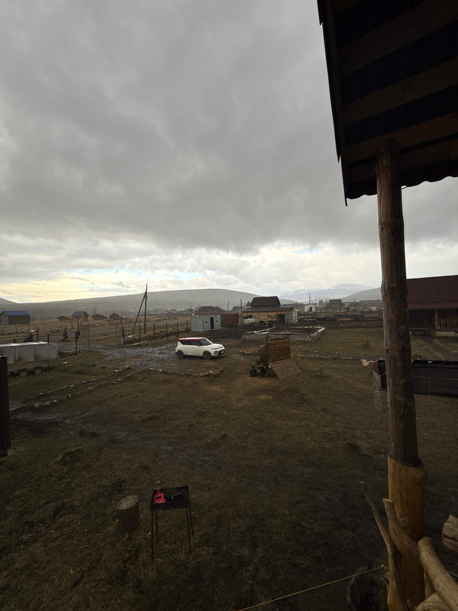 The image shows a view overlooking a landscape in what appears to be the vicinity of Kordonnyi, Russia. The sky is overcast with heavy clouds. The terrain is a mix of fields and what seems to be a sma…read more