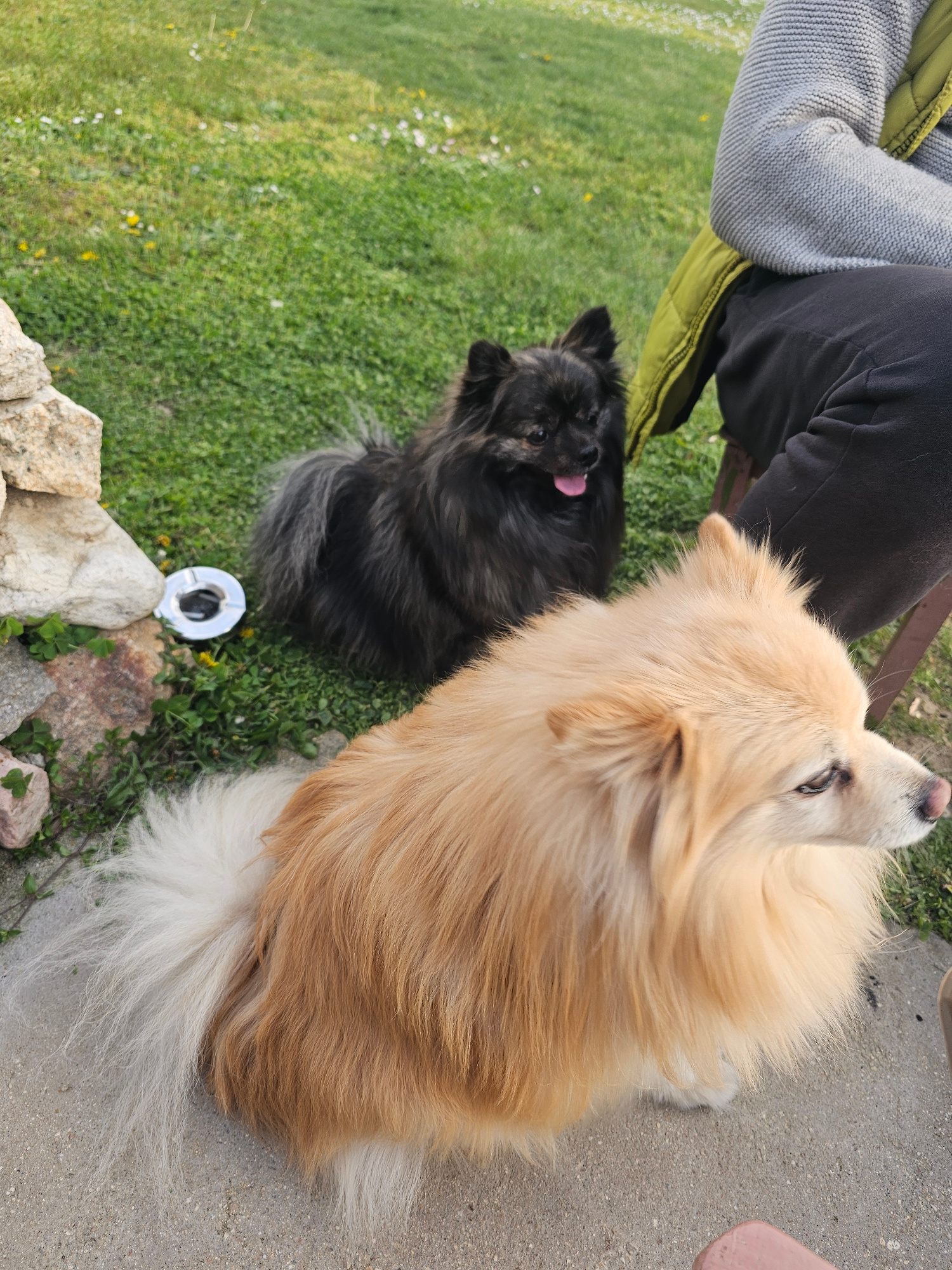 A high-angle shot depicts two dogs near what appears to be a person seated on a bench. One dog is a tan/white color, and the other is black. The tan dog is on a cement surface while the black dog is o…read more
