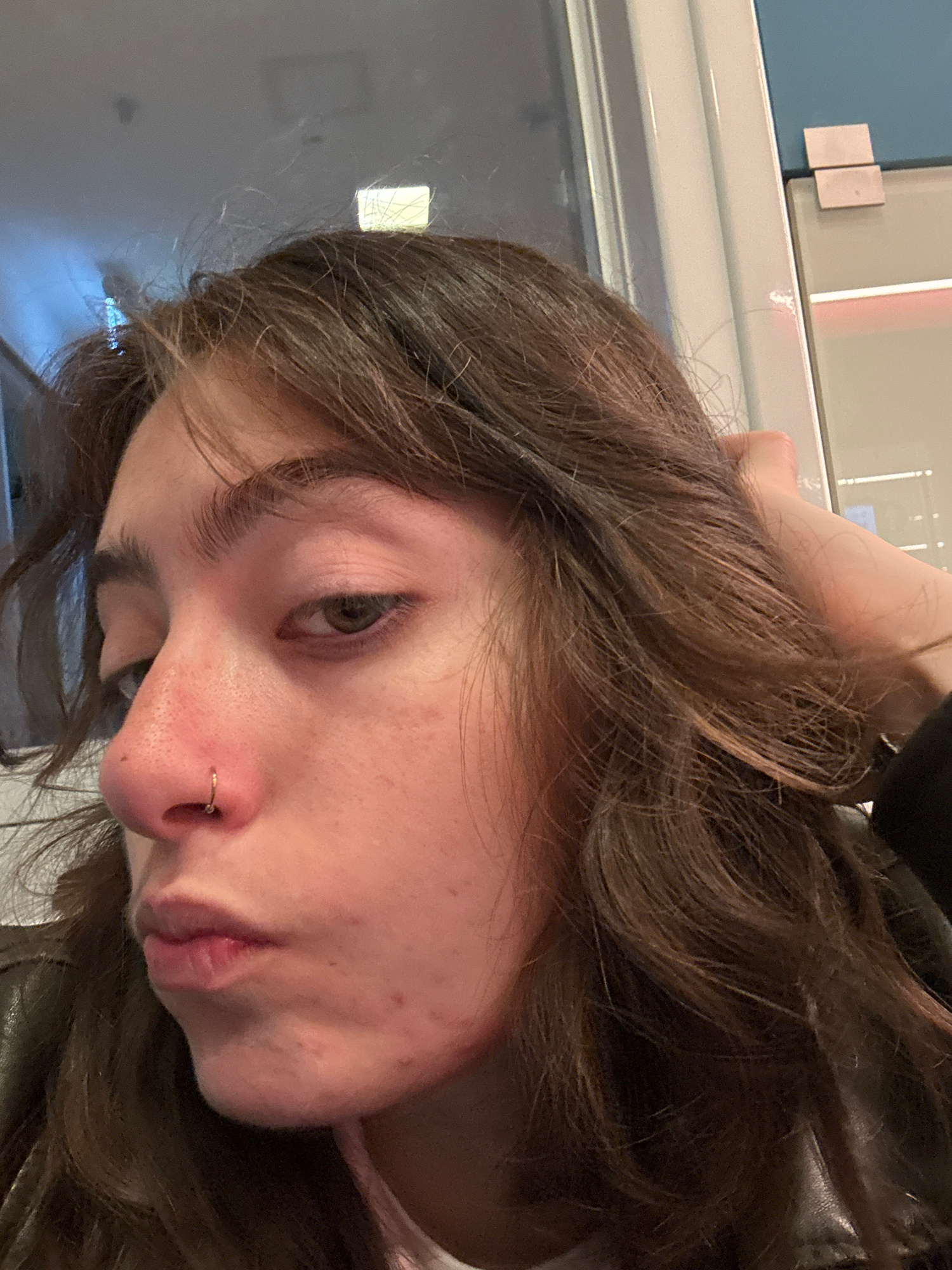 A close-up selfie of a person with brown hair and a nose ring. The person is indoors, reflected in a window. The background includes a blue panel and a white frame. The image does not contain informat…read more