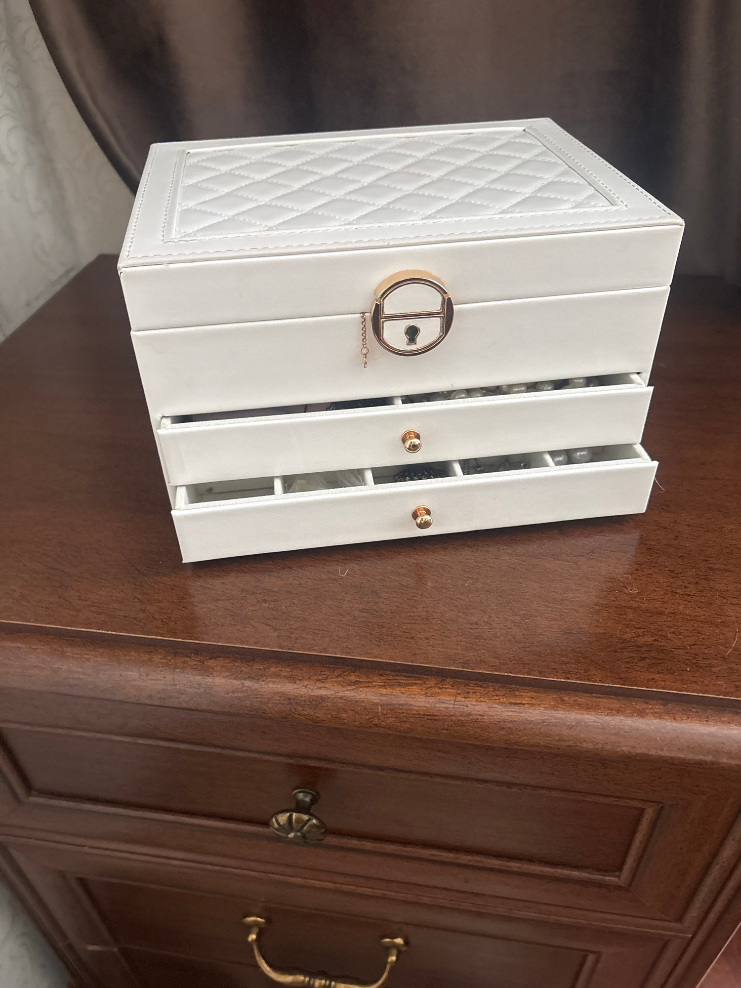 A white jewelry box with a diamond-stitched pattern sits on a wooden cabinet with ornate hardware. The jewelry box has three compartments, two of which are open, revealing what appears to be jewelry i…read more