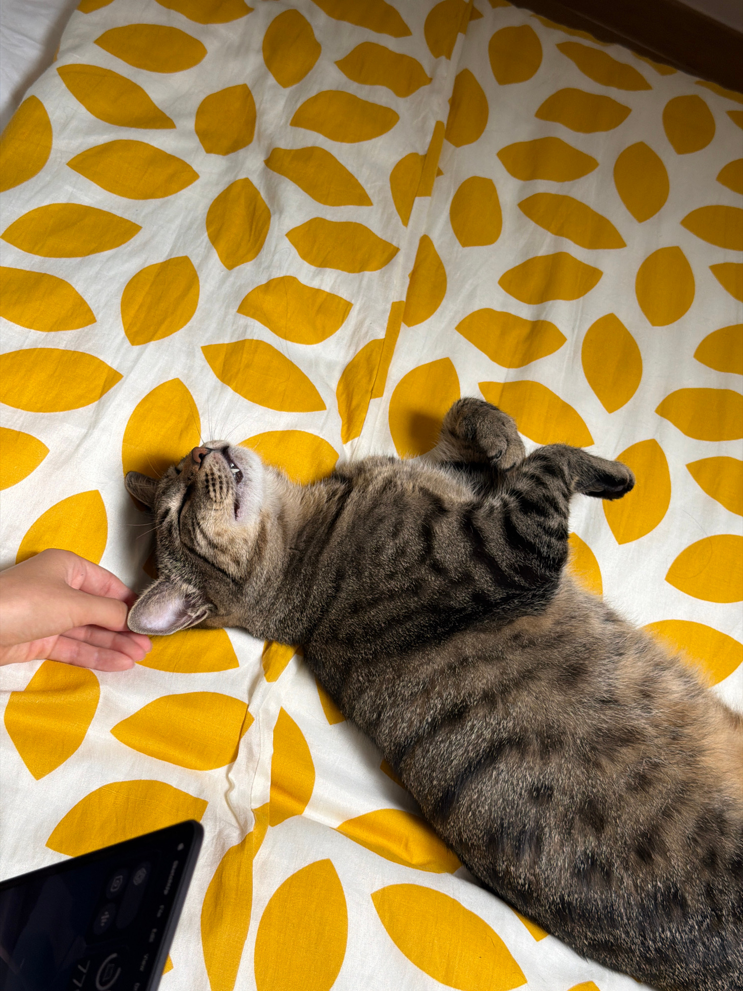 An overhead shot captures a relaxed tabby cat lying on its back on a bed, which is covered with a white sheet adorned with a repeating pattern of abstract, irregular yellow shapes resembling leaves. T…read more