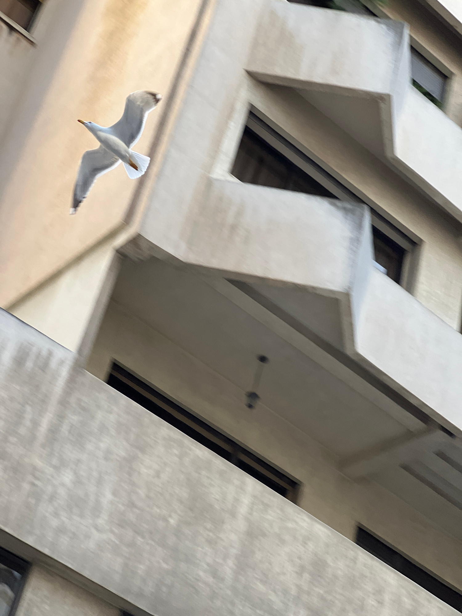 A low-angle urban scene in Tanger, Morocco, depicts a white and light grey seagull in mid-flight, positioned against the facade of a multi-story building. The bird, with outstretched wings and an oran…read more
