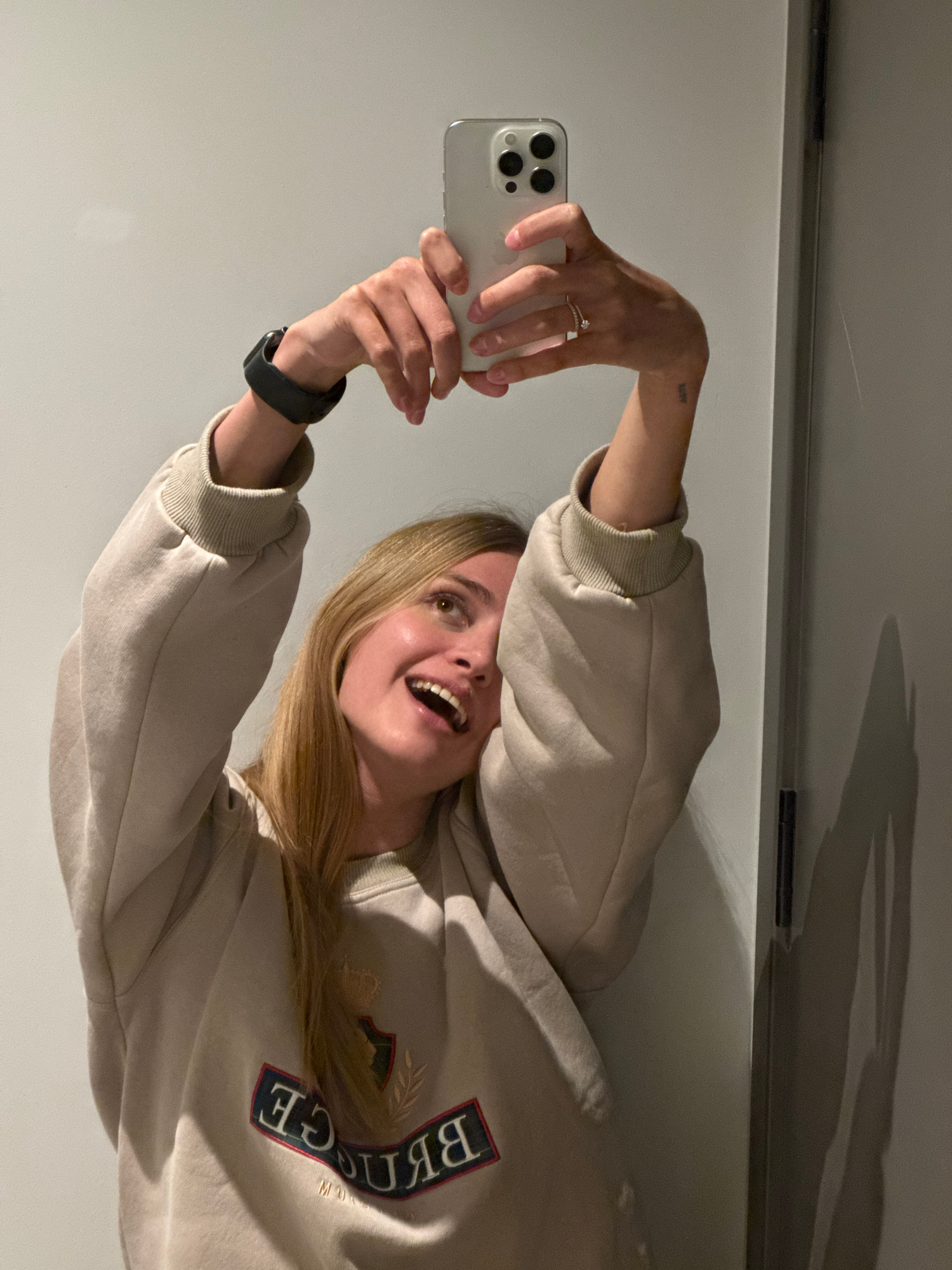 A woman is taking a selfie indoors, holding a white smartphone. She is wearing a beige sweatshirt with the word "BRIDGE" embroidered on it, and a black smartwatch on her left wrist. She also has a rin…read more