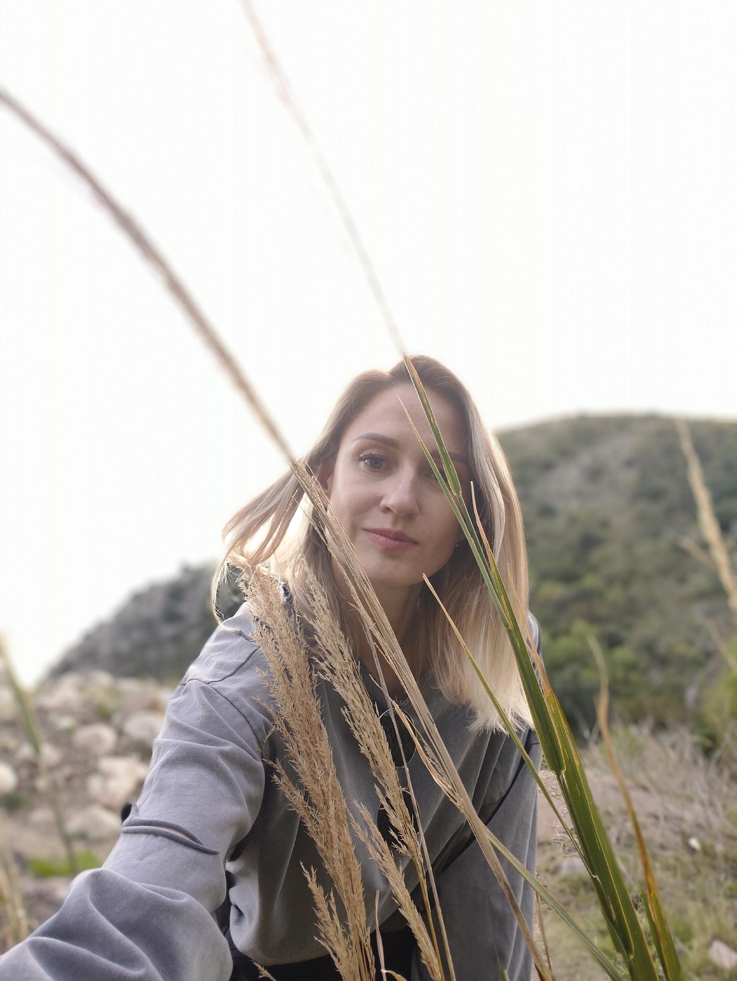 A fair-skinned woman with blonde hair is the primary subject of the image. She is wearing a gray sweatshirt or jacket. The woman is positioned in the foreground, surrounded by tall grass or reeds. A s…read more