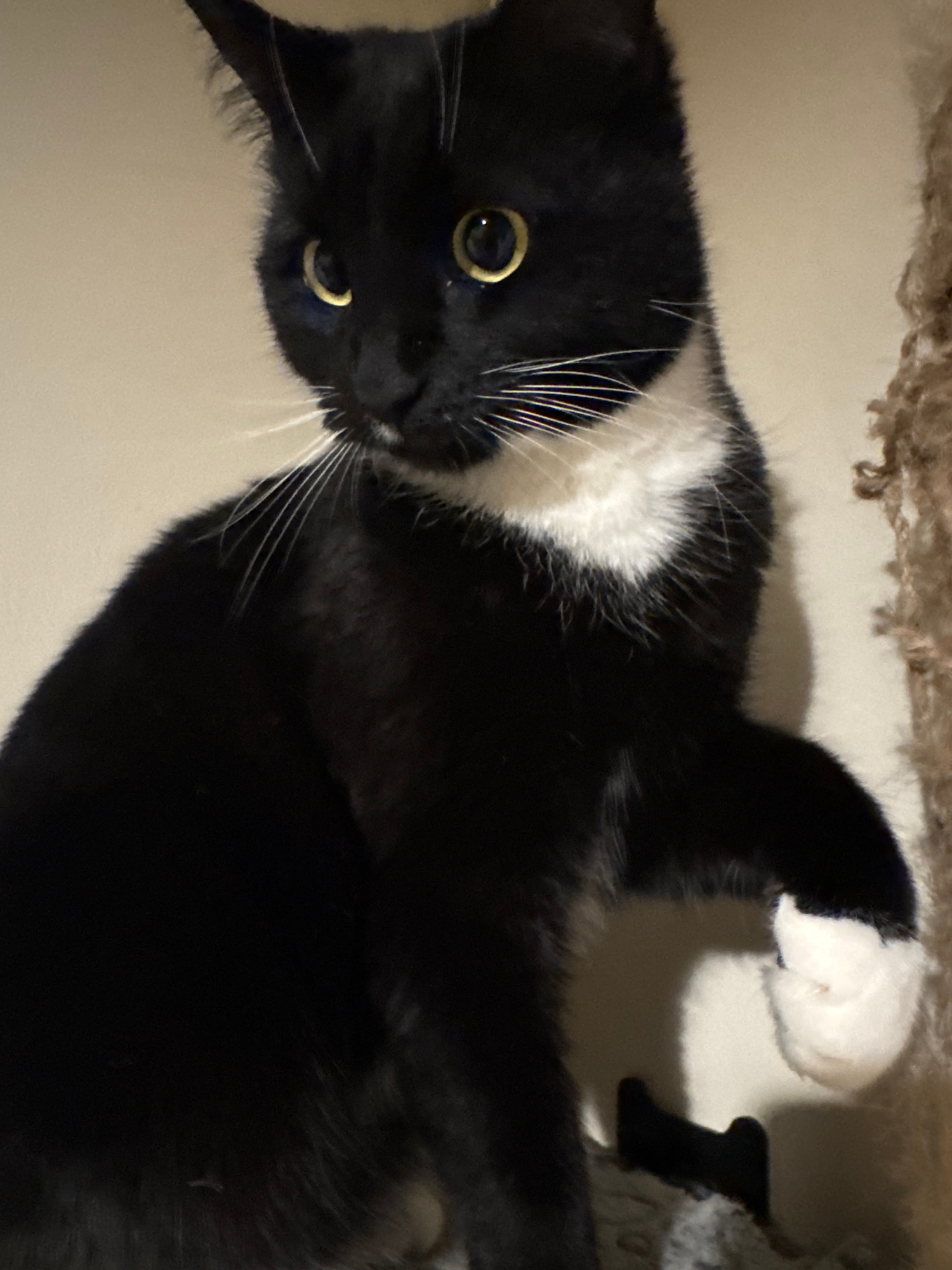A black and white cat lies on its side on a beige surface. The cat's head is in the lower left corner of the image, its face tilted toward the viewer. Its eyes are golden. The cat has a white bib on i…read more