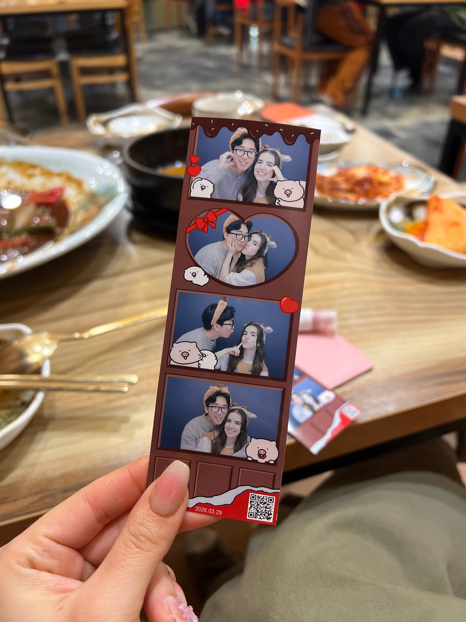 A hand holds a photo strip depicting a couple in various poses, adorned with cartoon pig and bear ears, suggesting a fun, playful setting. The strip is framed in a chocolate bar design and features a…read more