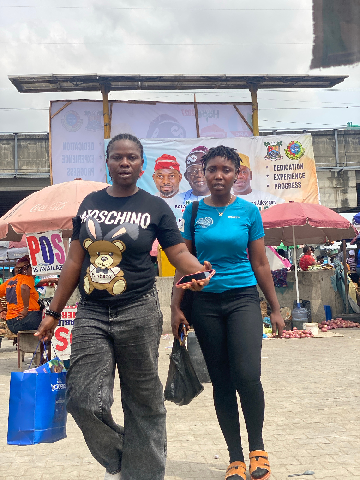 This image, presented vertically, captures an outdoor street scene in Lekki, Nigeria, characterized by market activity under an overcast sky. In the foreground, two women are posing for the camera. T…read more