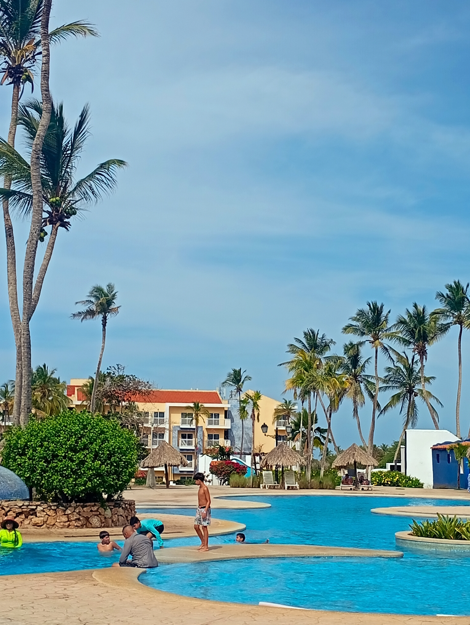 The image depicts a pool scene at a resort in Playa El Agua, Venezuela. Several individuals are in and around a multi-level swimming pool. Some are wading, some are swimming, and others are standing o…read more