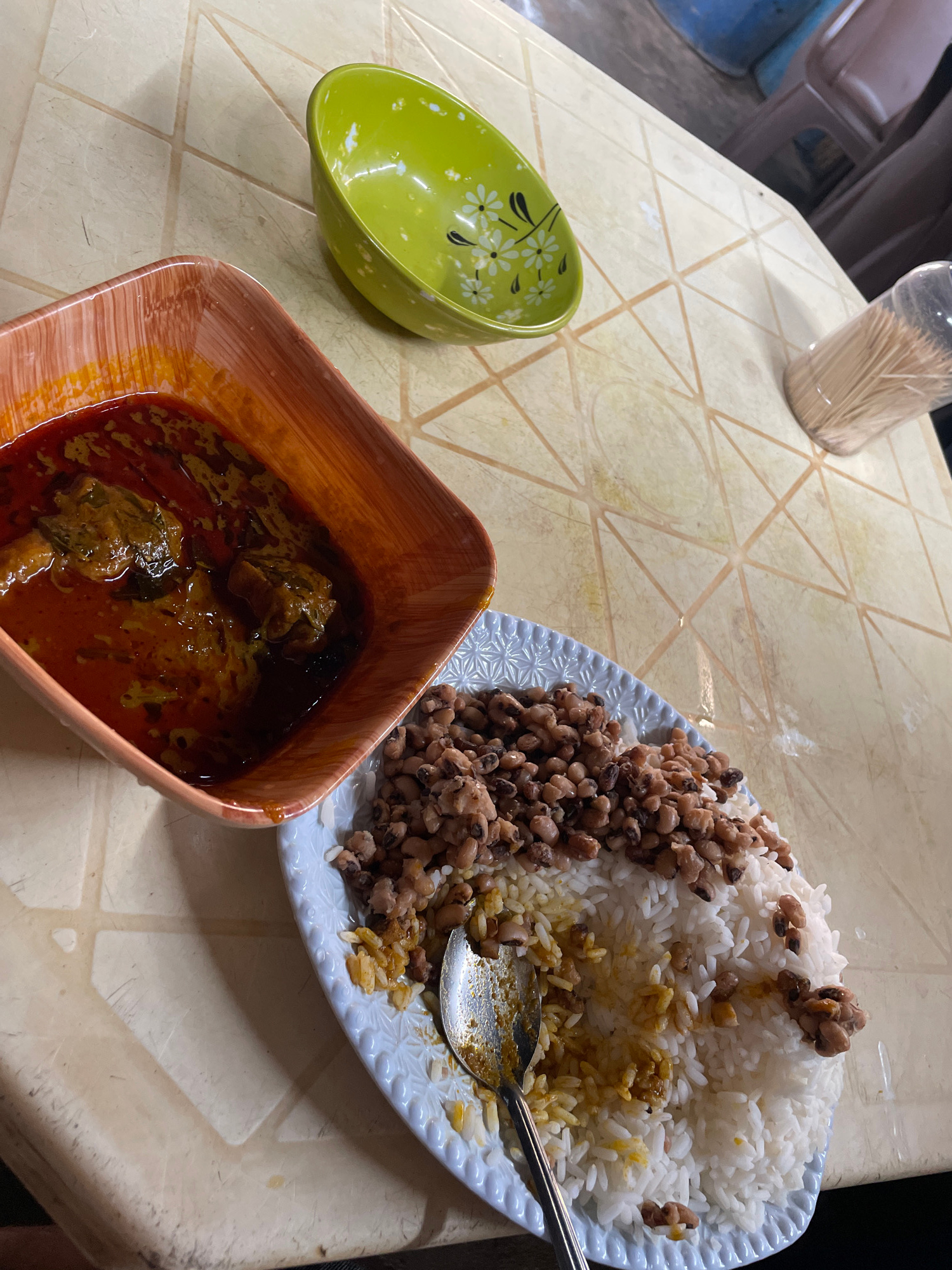 On a patterned, off-white table, likely indoors, a plate of white rice and brown beans is positioned next to a square bowl filled with a red-brown curry. A green bowl with white floral patterns sits t…read more