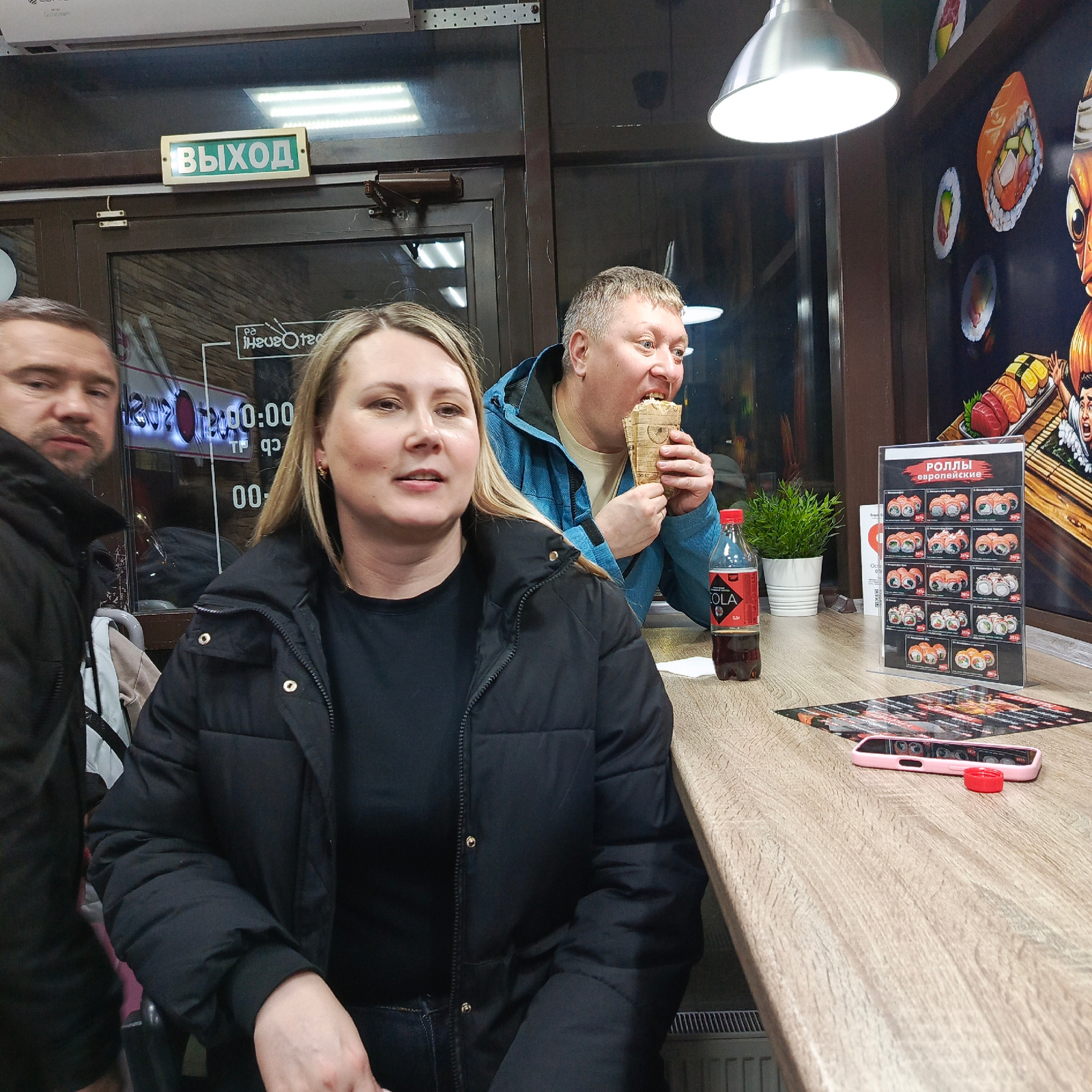 The image captures a scene inside a sushi restaurant. A woman in a black puffer jacket and black shirt sits at a light wood counter. To her left, a man in a black jacket stands beside her. Behind them…read more