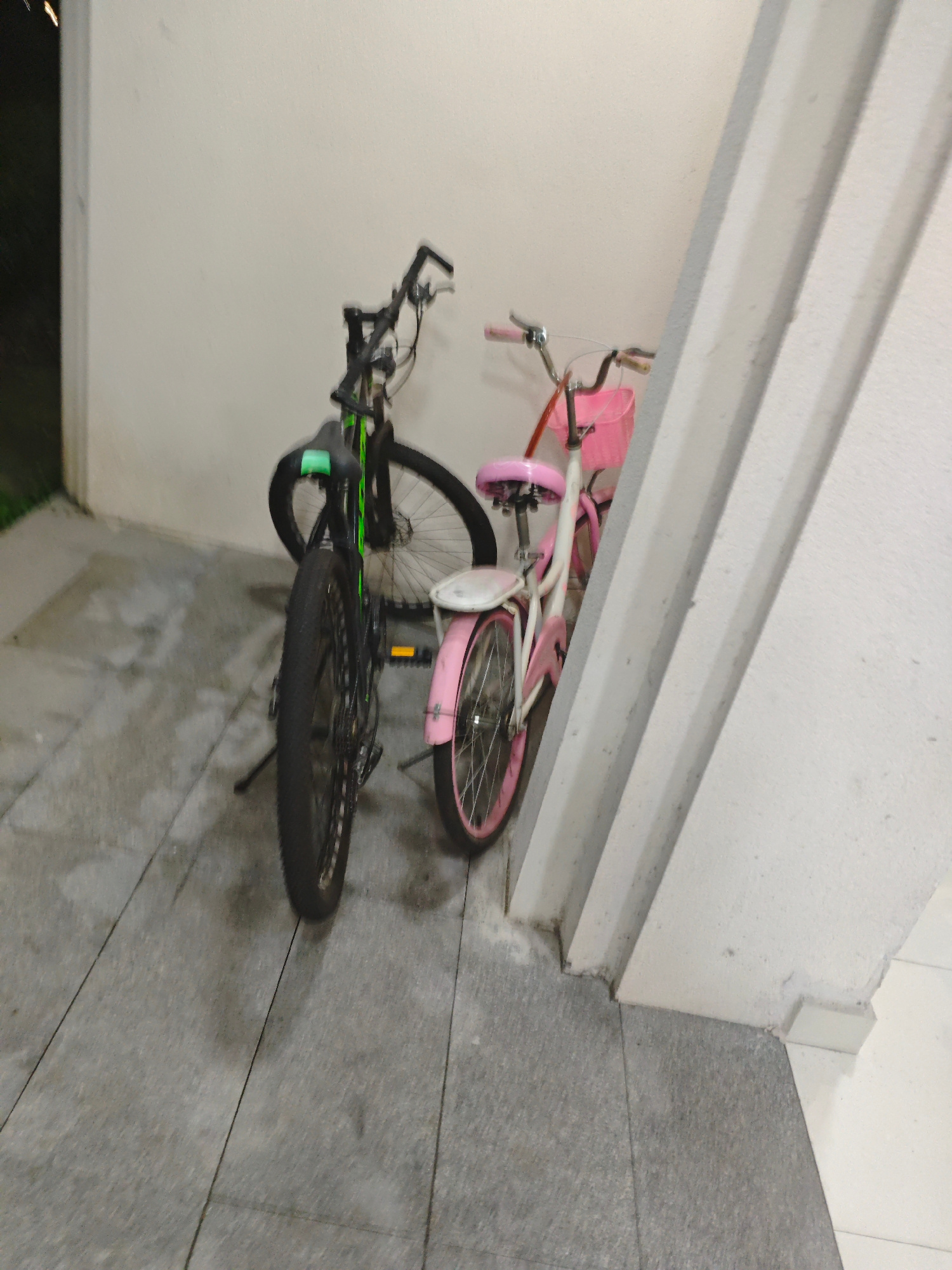 The image displays two bicycles parked against a light-colored wall, likely in a sheltered outdoor area or corridor, characteristic of an urban environment such as the Chongqing High-tech Zone, China.…read more