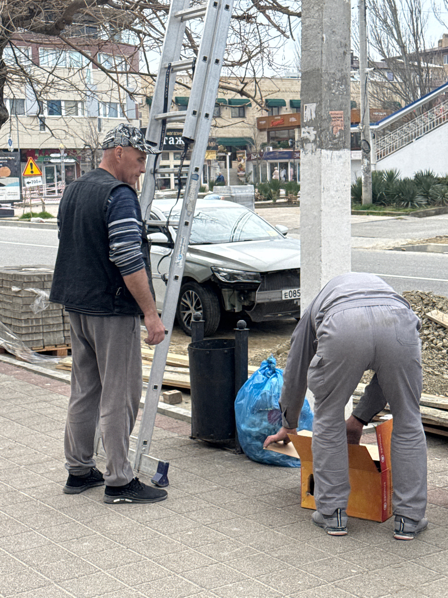 This image depicts an urban street scene in Anapa, Russia, characterized by ongoing activity or work. In the foreground, two individuals are present on a paved sidewalk. The individual on the left is…read more