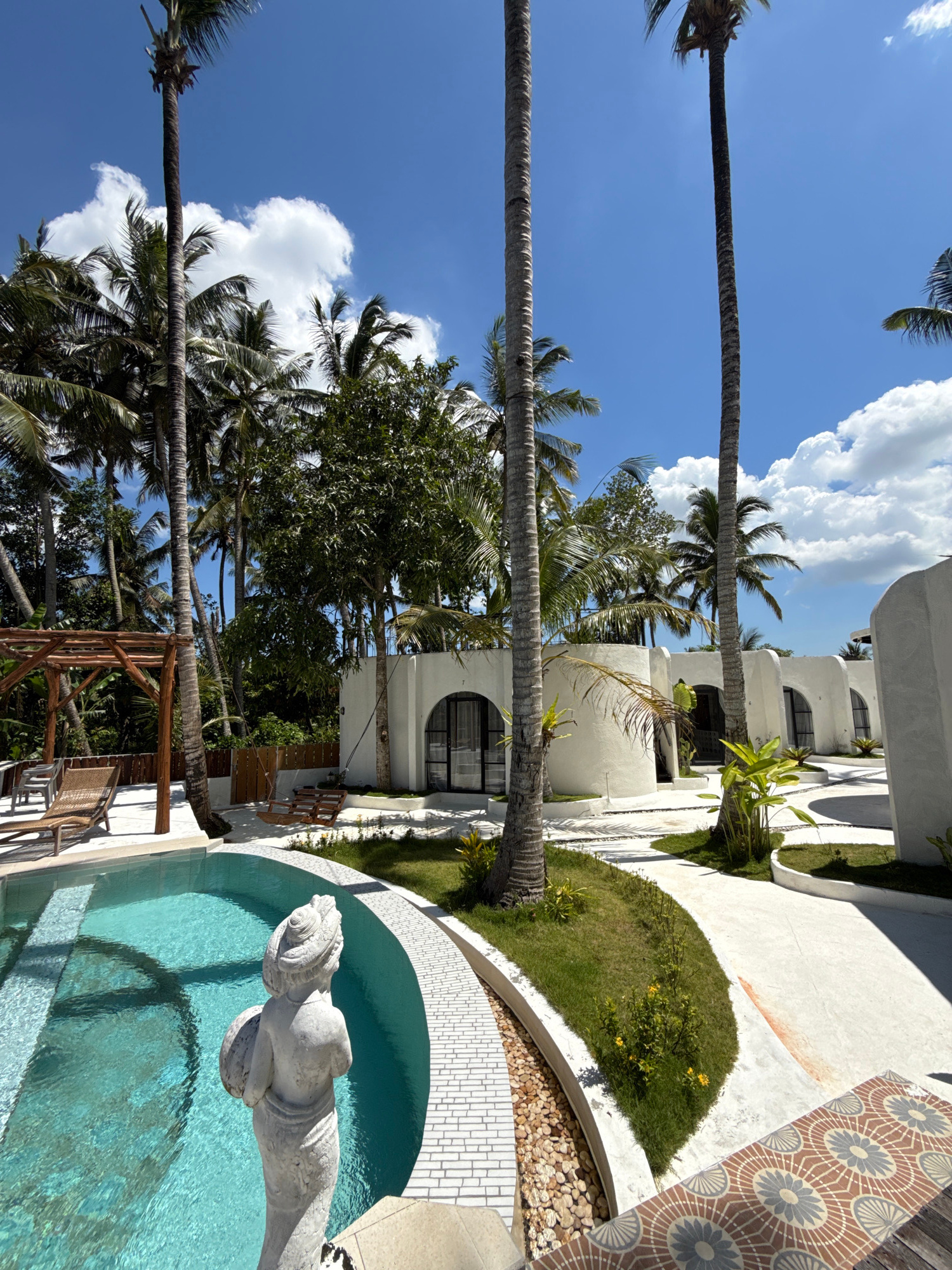 The image shows a tropical scene in Gubug, Indonesia. Palm trees stretch across a bright blue sky dotted with white clouds. The lower portion of the image features white buildings with arched windows…read more