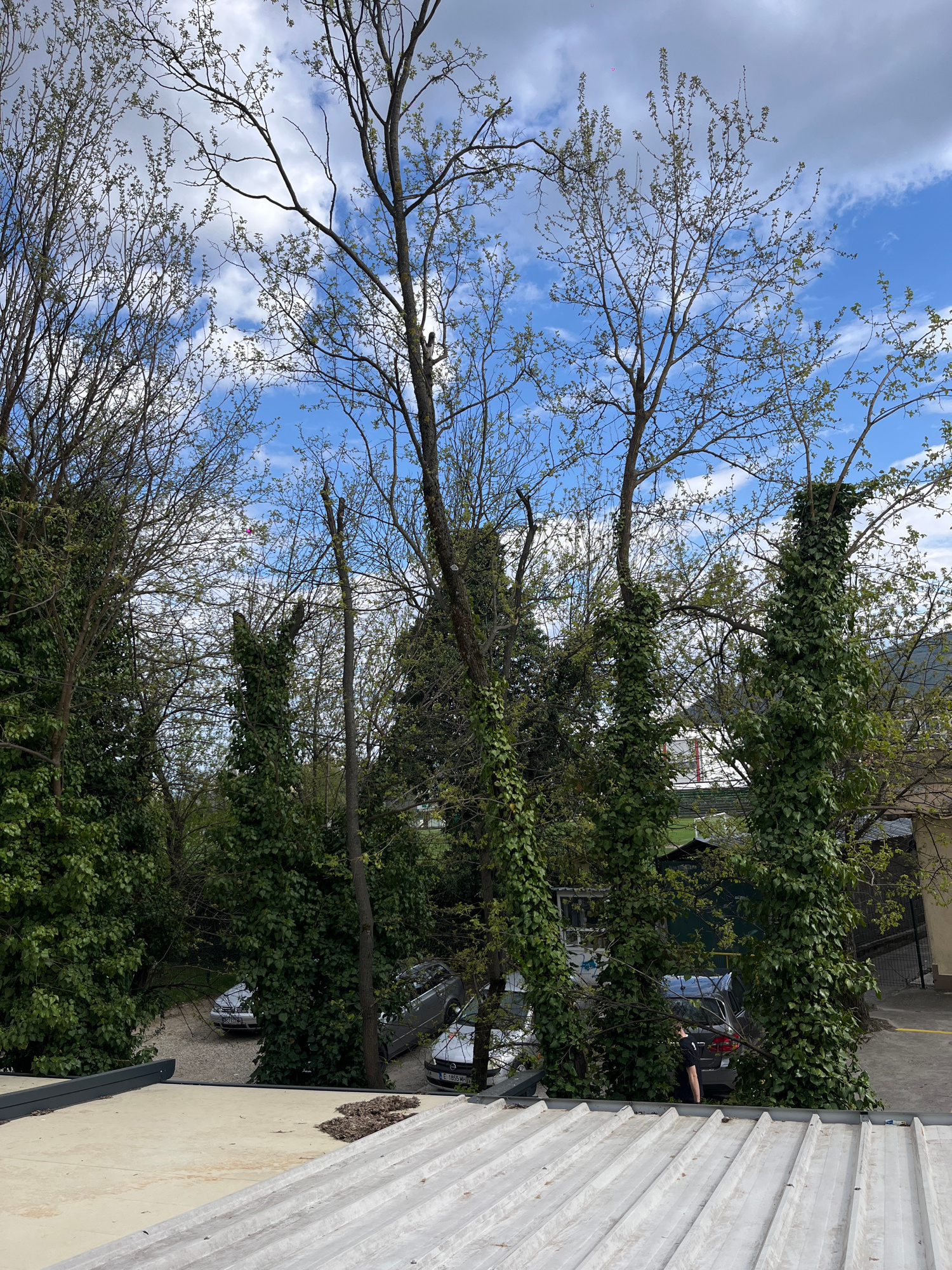 The image presents a scene in Gotse Delchev, Bulgaria, showing a view from an elevated position, possibly a rooftop, overlooking trees, buildings, and parked cars. The sky is visible through the brancβ¦read more