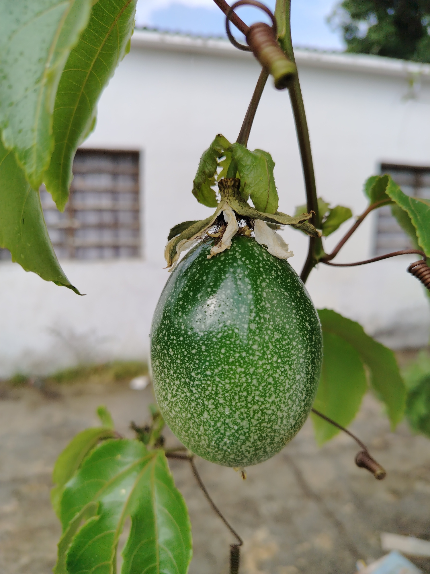 The image shows a green passion fruit hanging from a vine. The fruit is speckled with lighter green spots and has remnants of the flower still attached at the top. Green leaves are visible around the…read more