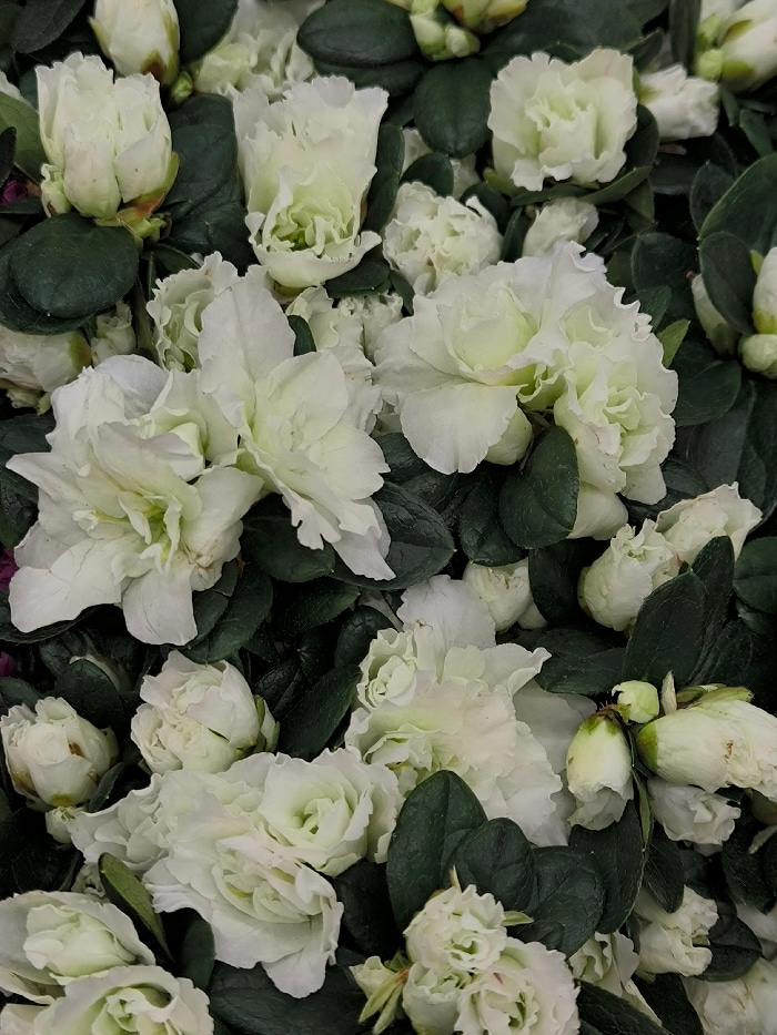 The image displays a dense, top-down view of numerous white and off-white azalea-like flowers. The scene is filled with a proliferation of blooms at various stages of development, including fully open…read more