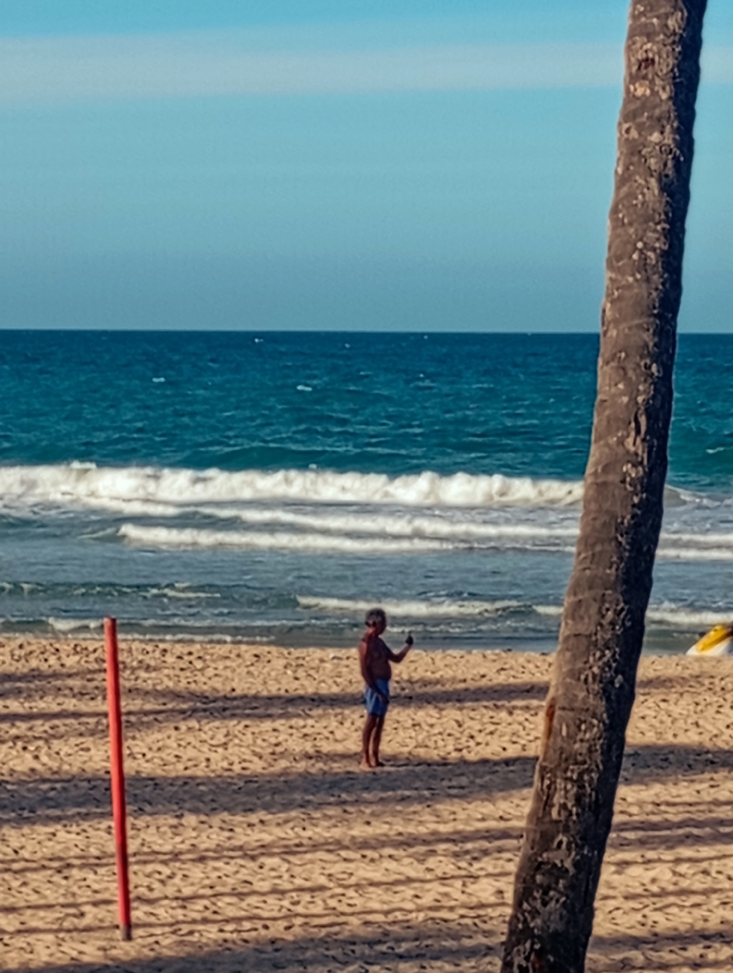 The image depicts a daytime scene at Playa El Agua, Venezuela. A single individual, an adult male wearing blue swim trunks, stands on the sandy beach in the middle ground. He is positioned facing sligβ¦read more