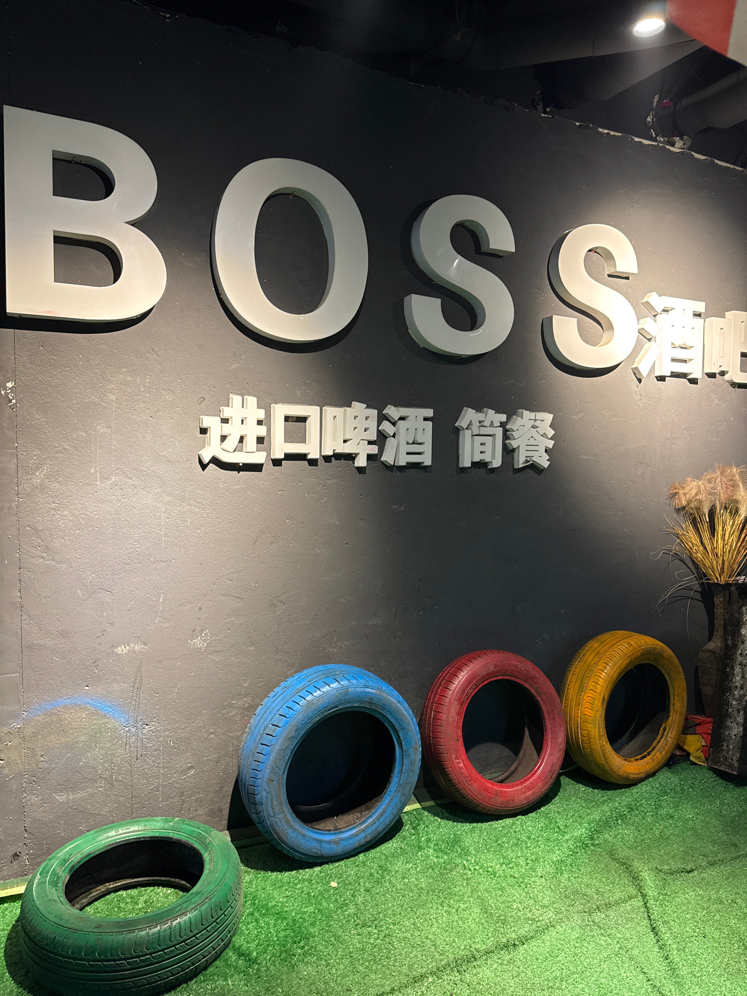 A tilted medium shot reveals a wall display, likely inside a building, composed of large white "BOSS" lettering and Chinese characters. Adjacent to this writing are four stacked tires painted yellow,…read more
