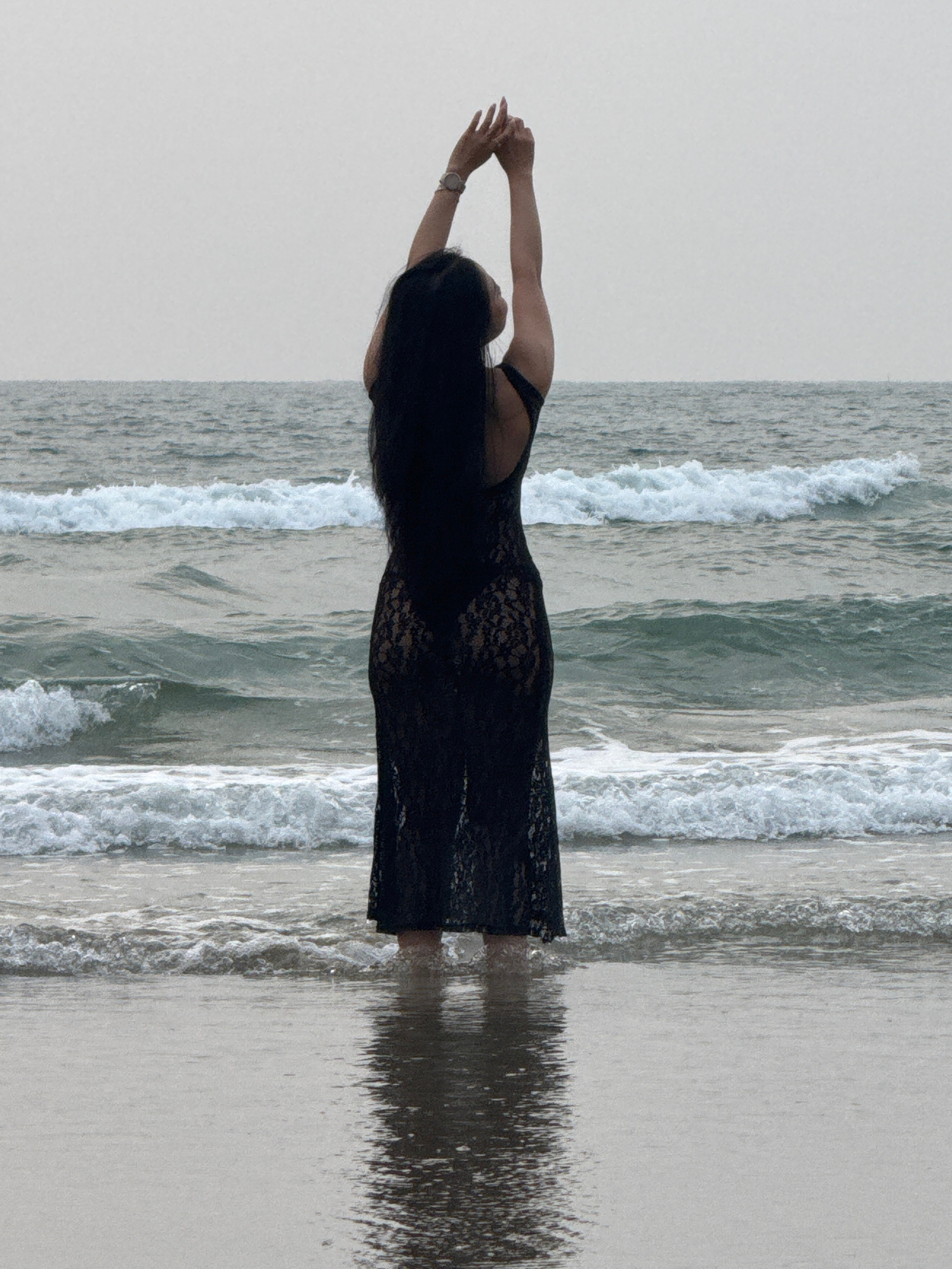 A woman in a black dress stands in the surf on a beach. She is facing away from the camera, with her arms raised above her head. The waves are gentle, and the sky is overcast. The specific location wi…read more