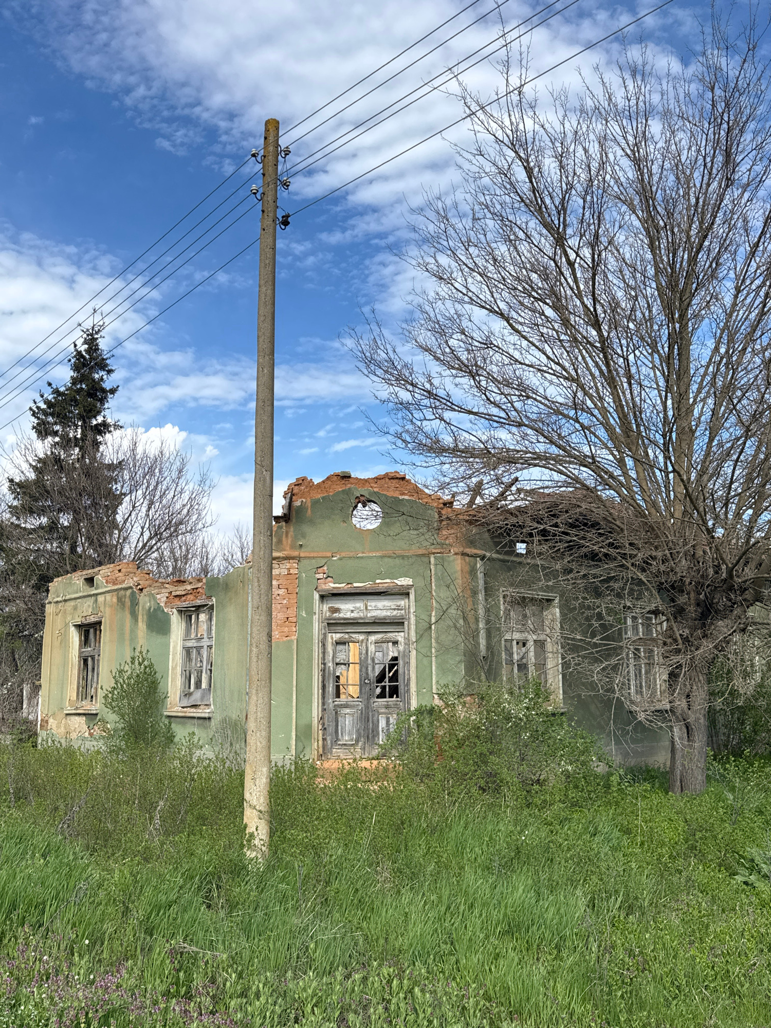 An exterior view of a dilapidated, possibly abandoned, two-story building in Krushovitsa, Bulgaria. The building is constructed of a light green material. Several windows are visible, many with broken…read more