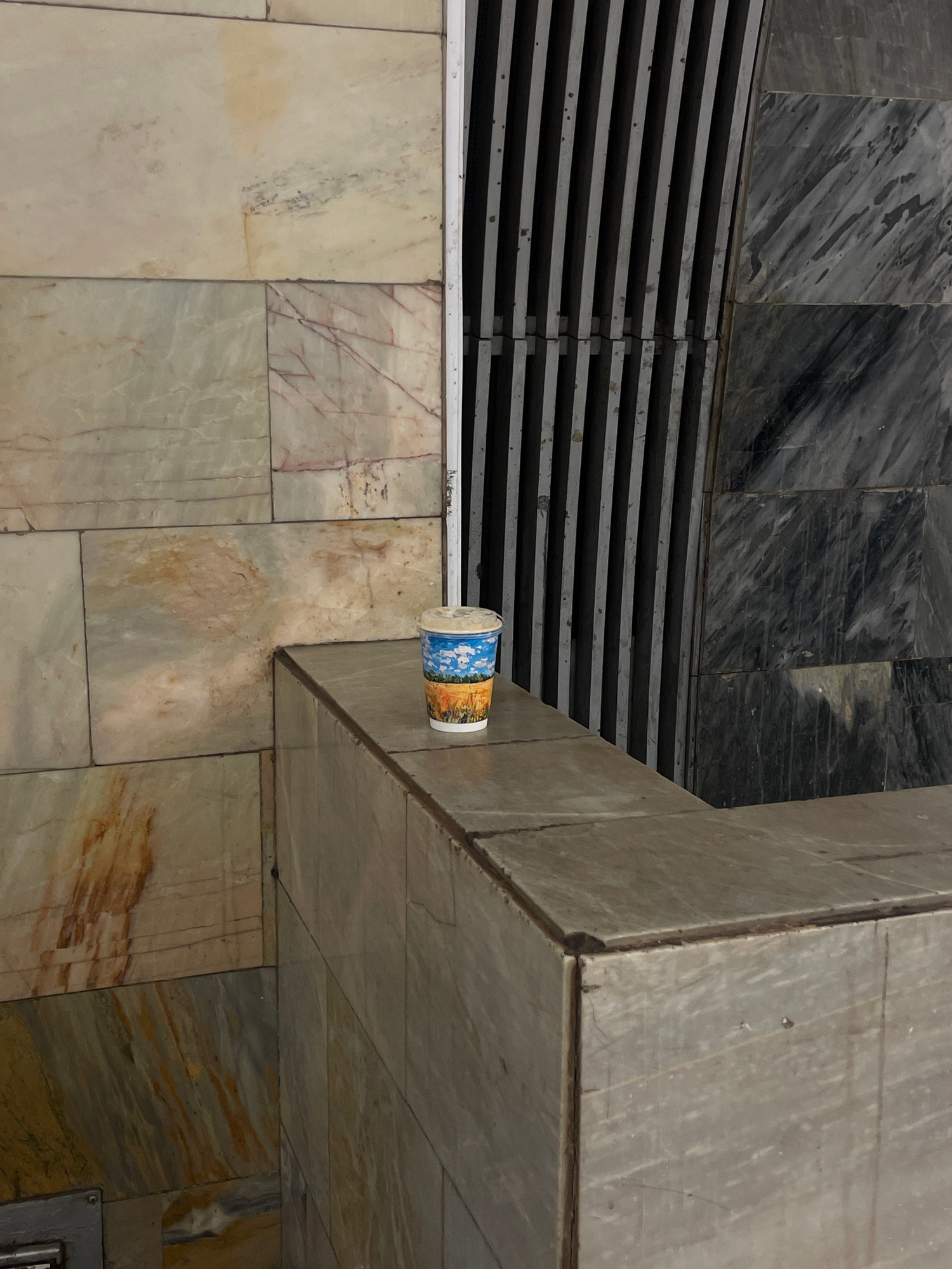 The image shows a corner of a marble structure in Moscow, Russia. The floor and lower wall are clad in light-colored marble tiles with a vein pattern. Above a metal grate, the wall transitions to dark…read more