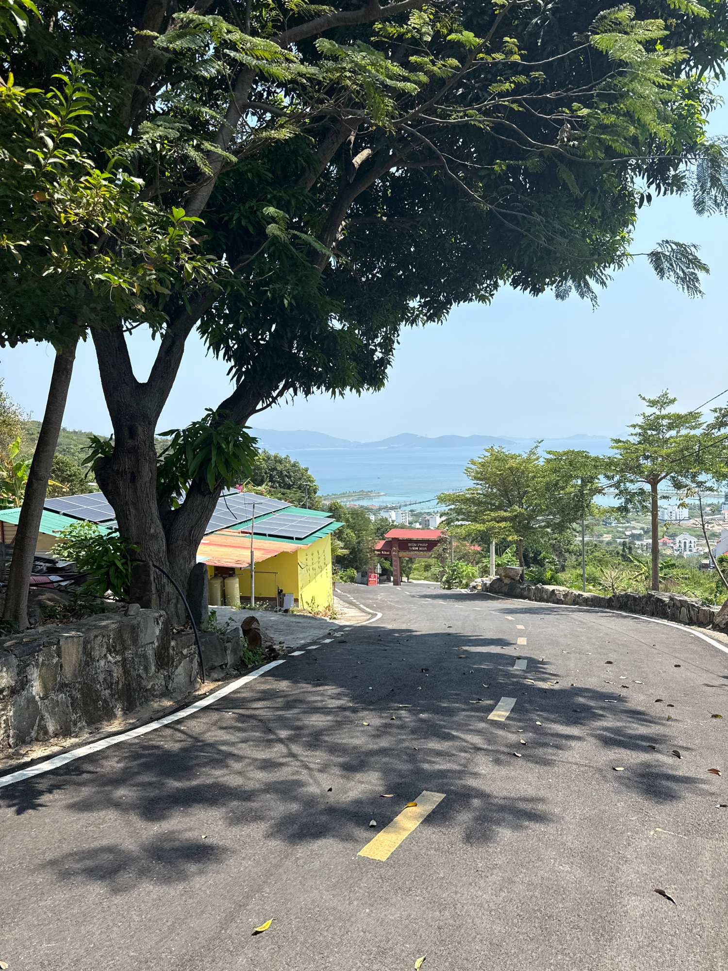 The image shows a road curving downhill in a partially residential area near the coast, potentially in Nha Trang, Vietnam. The road surface is asphalt with yellow painted lines. The road is bounded by…read more