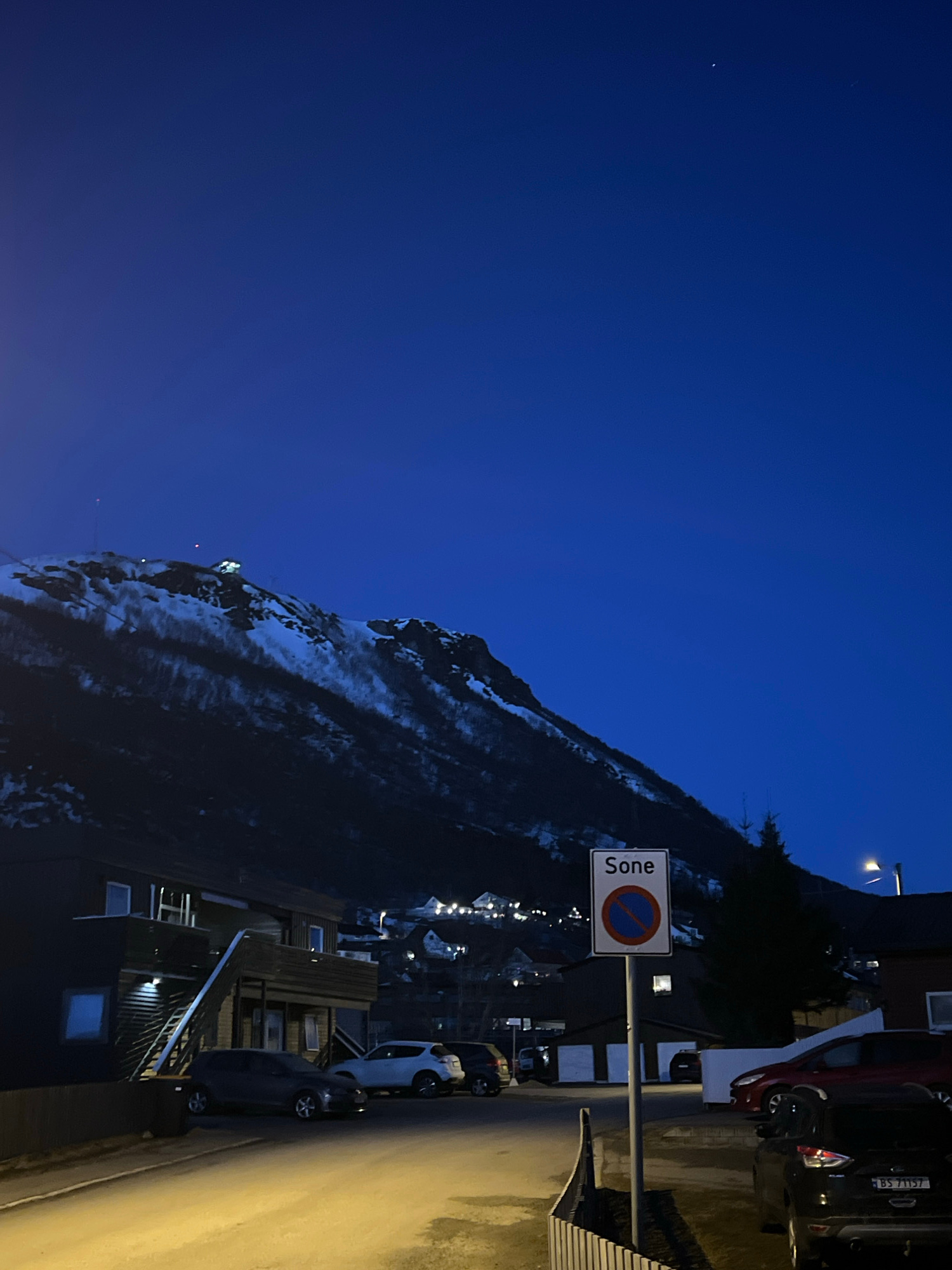 This image captures a nocturnal or deep twilight scene in Tromsø, Norway, featuring a town nestled against a snow-dusted mountain under a vast, dark blue sky. The left side of the frame is dominated…read more