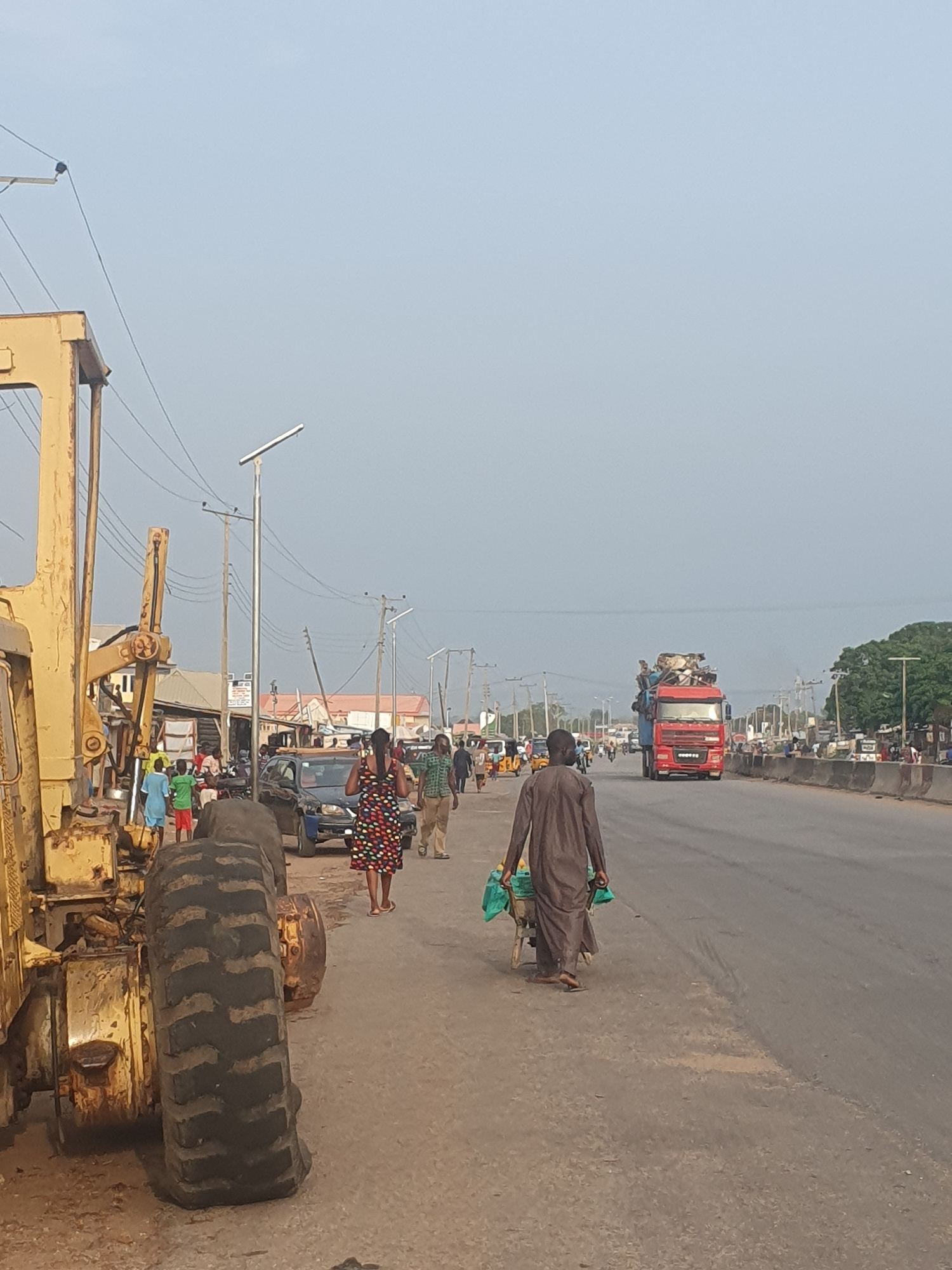 The image depicts a busy street in Lokoja, Nigeria. A red truck overloaded with passengers is moving down the road. A man in traditional clothing is walking alongside the road pulling a cart with gree…read more