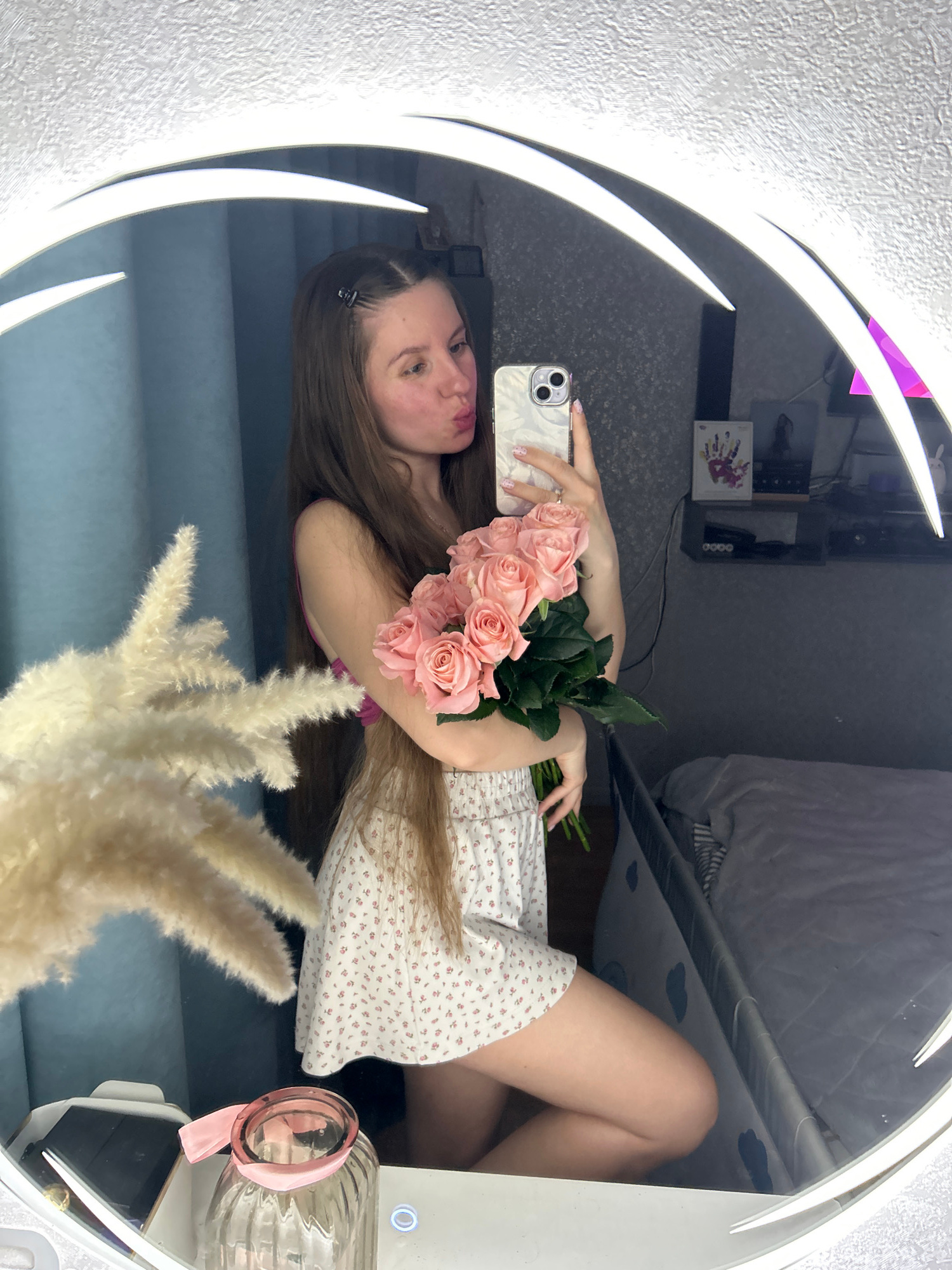 The image shows a woman posing for a selfie in a mirror. She is holding a bouquet of light pink roses. The mirror is illuminated with a circular light fixture. Reflected in the mirror is a room with a…read more