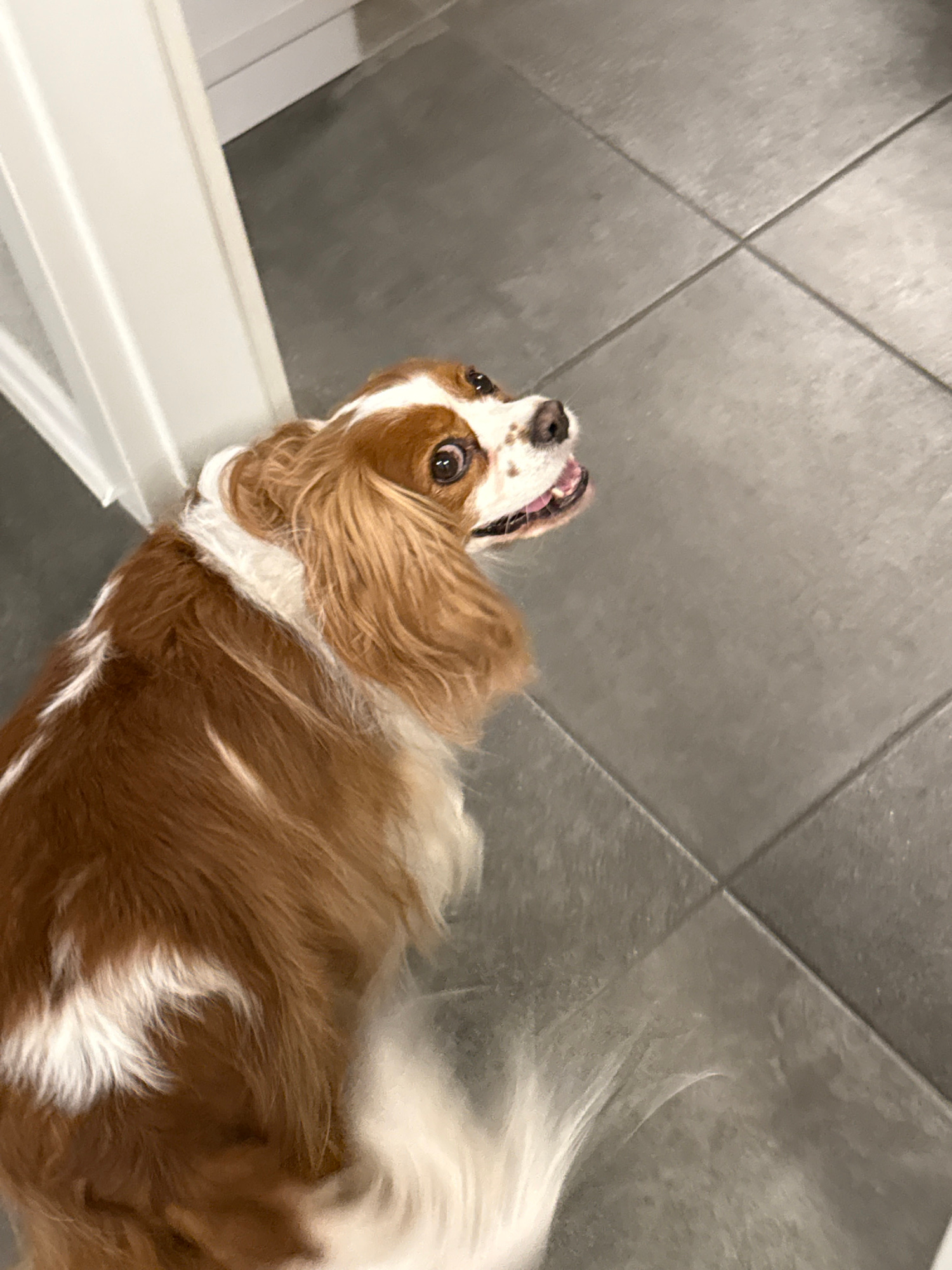 A Cavalier King Charles Spaniel dog lies on gray tile flooring next to a white object, possibly a baseboard. The dog is predominantly brown and white, with its head tilted upwards and mouth slightly o…read more