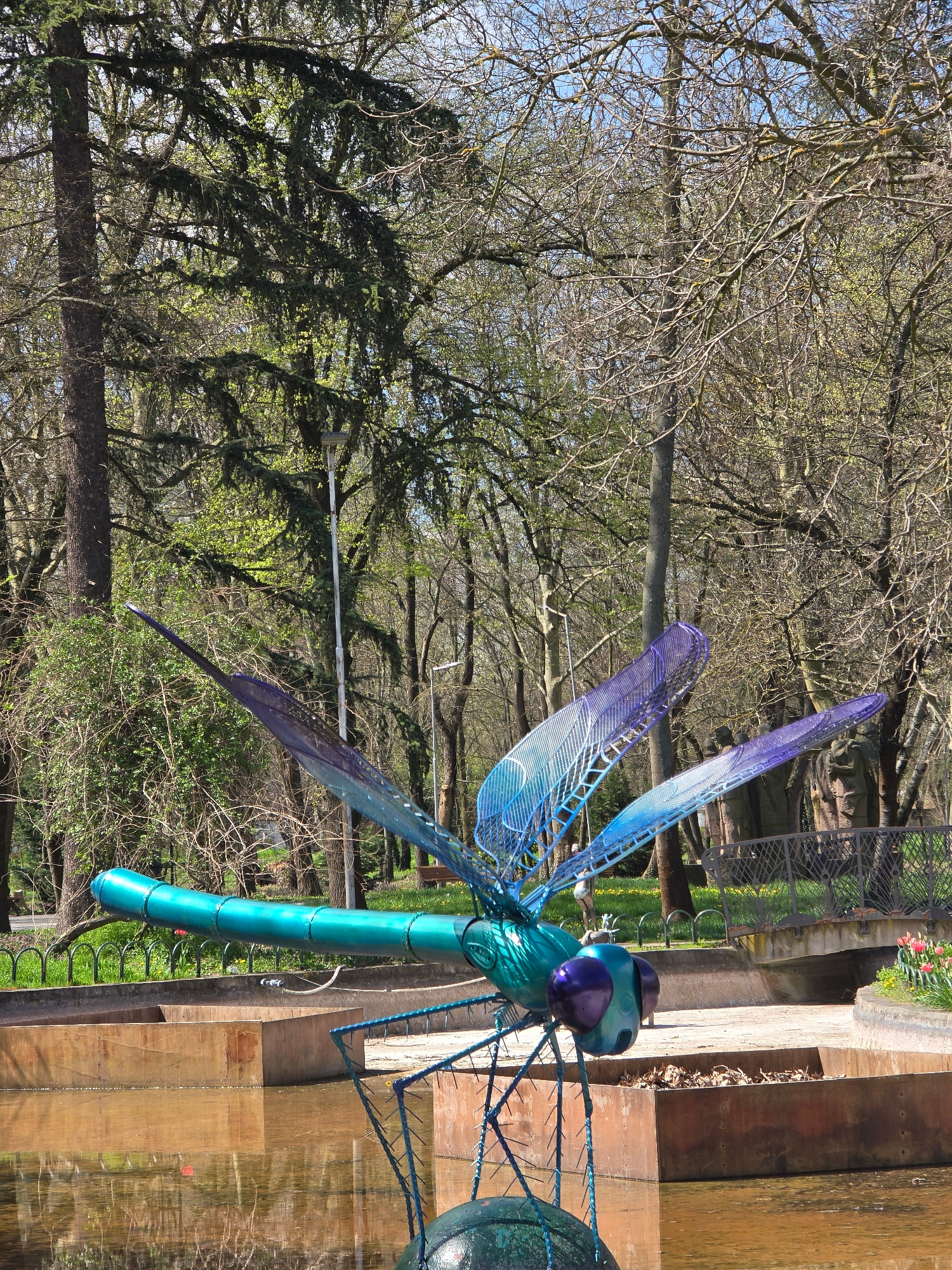 The image shows a turquoise and purple metal dragonfly sculpture installed on a wooden structure next to water, likely a pond or lake. The background features trees with both bare and budding branches, indicative of early spring. The dragonfly is positioned against this natural backdrop, suggesting the scene is a park or garden. The presence of a metal fence and some colorful flowers hint at a landscaped area. Specific to location, while I cannot definitively confirm if this image is from Yambol, Bulgaria, the environment and the type of sculpture installation could potentially be found in a public park or garden setting within a similar urban environment. Without any other visual clues or metadata, confirming its precise location in Yambol is not possible. | Open Wire