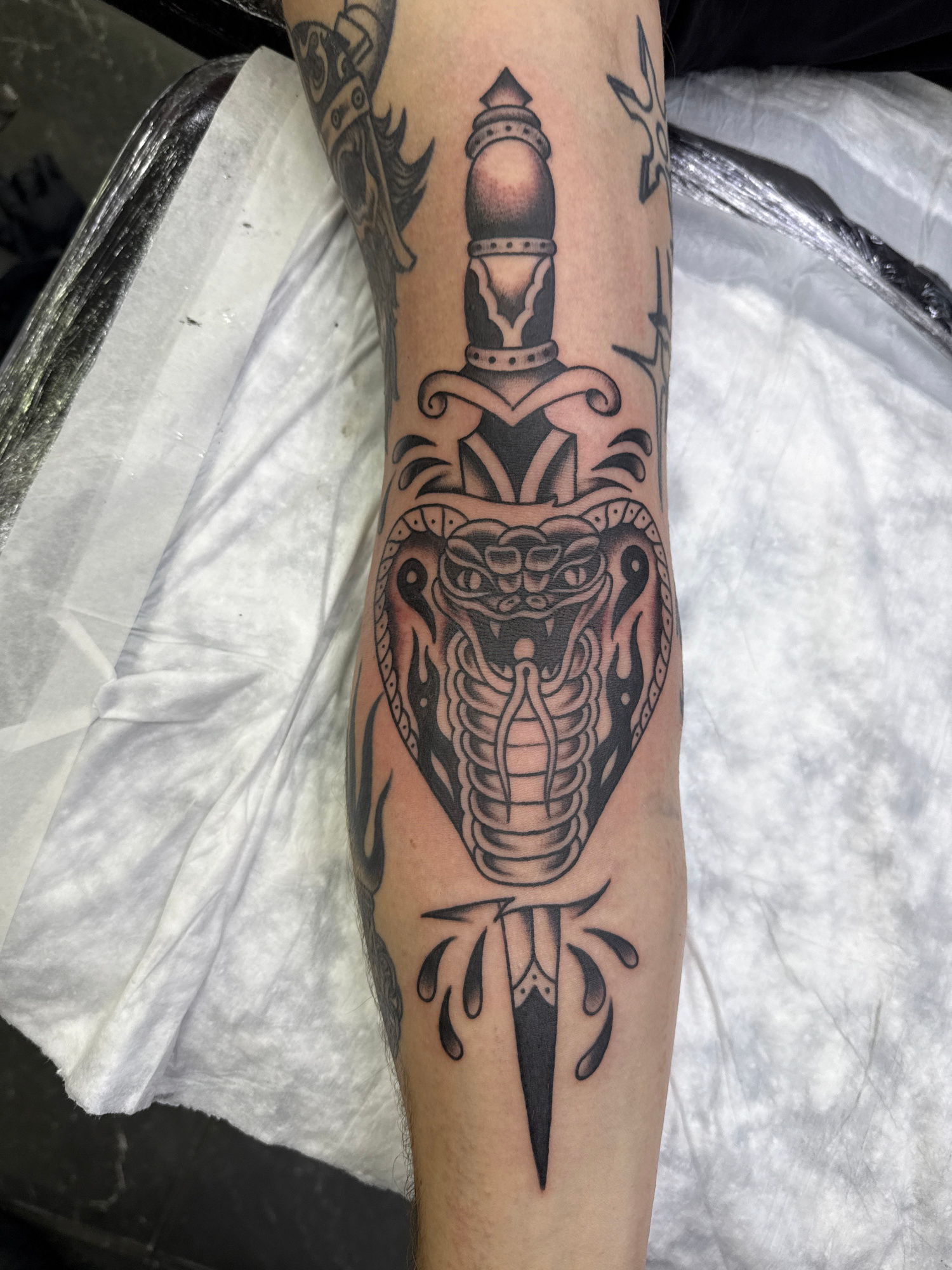 The image shows a tattoo of a snake coiled around a dagger. The tattoo is located on a person's arm. The tattoo is black and grey in color. The snake's head is positioned at the center, with the dagge…read more
