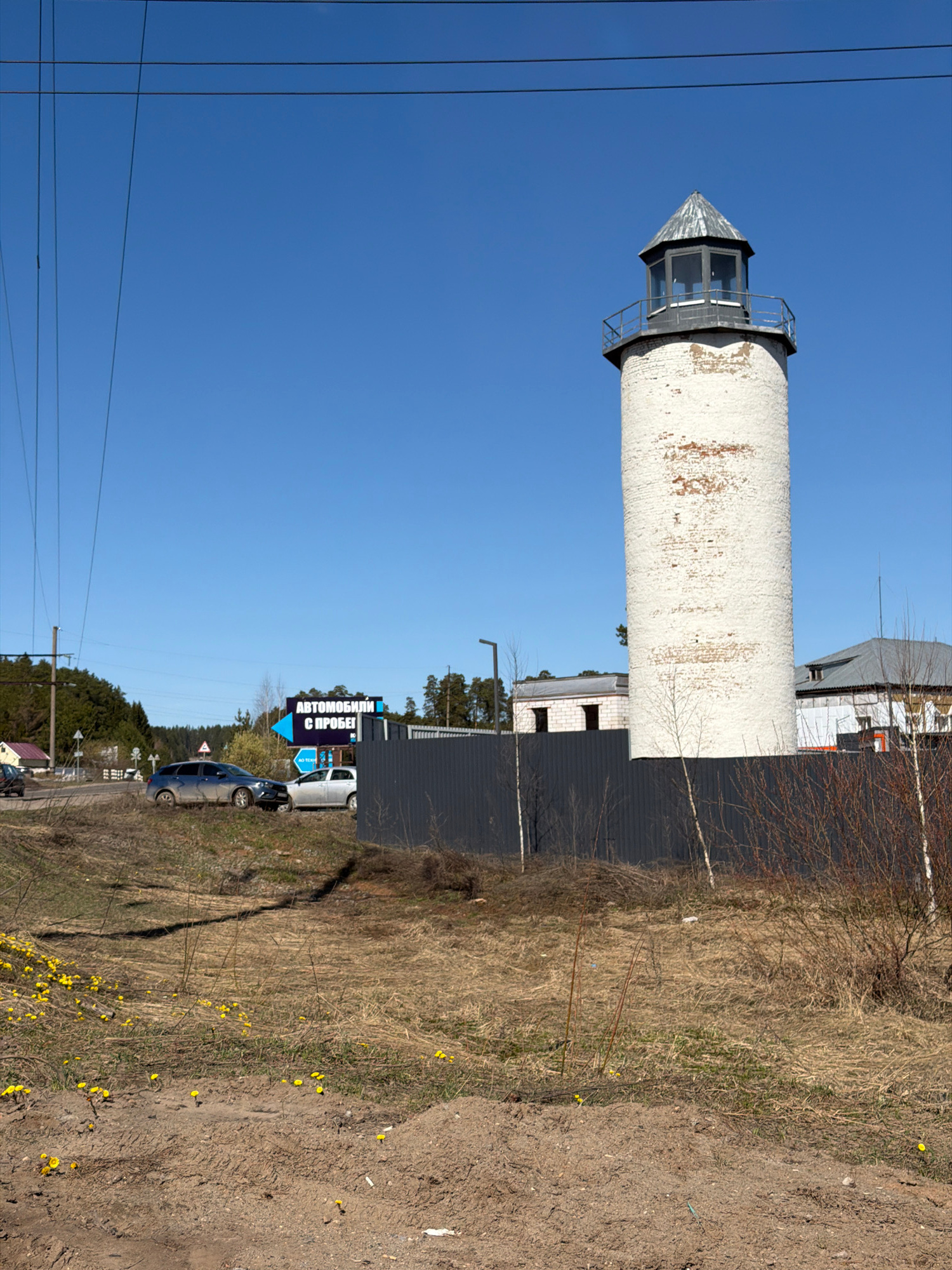 The image shows a white cylindrical structure with a dome-shaped top, possibly a lighthouse, in Votkinsk, Russia. The structure is adjacent to a building with a dark grey facade, visible behind some s…read more