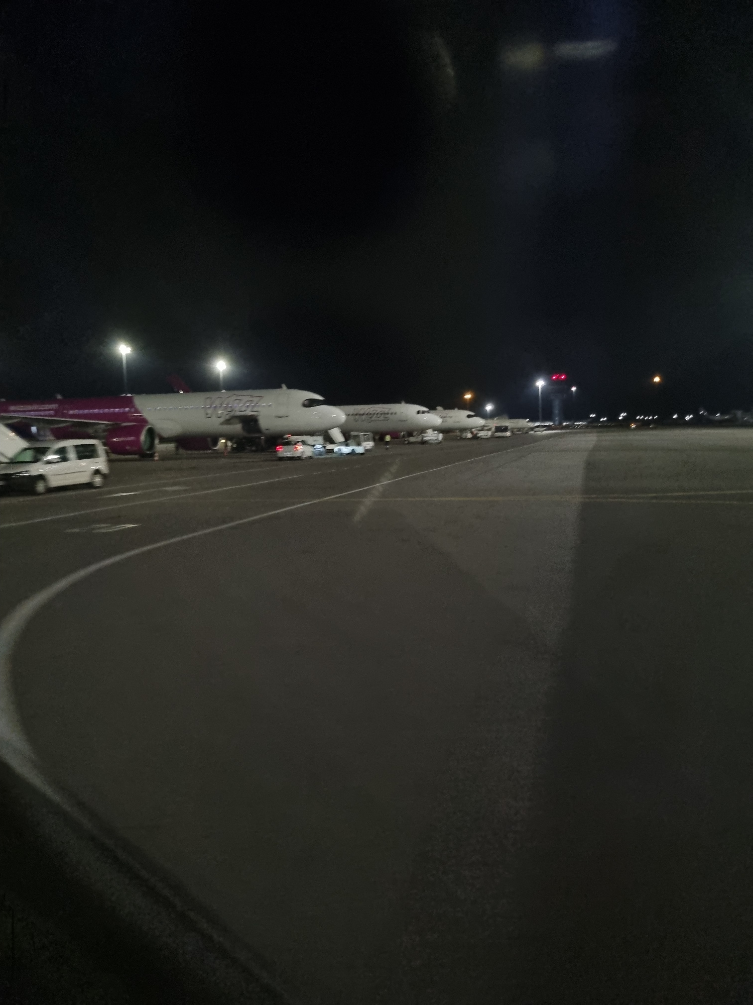 At night, the image depicts a row of parked airplanes along an airport tarmac, likely at Sofia Airport. The planes are mostly white with colored markings, including purple and red. Service vehicles, iā¦read more