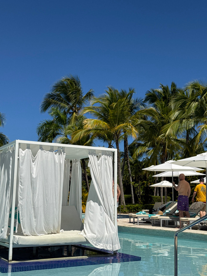 The image depicts a vibrant, sunny resort scene, likely poolside, viewed from a slightly elevated position. The sky, a clear and bright blue, dominates the upper left portion of the frame. Lush, tall…read more