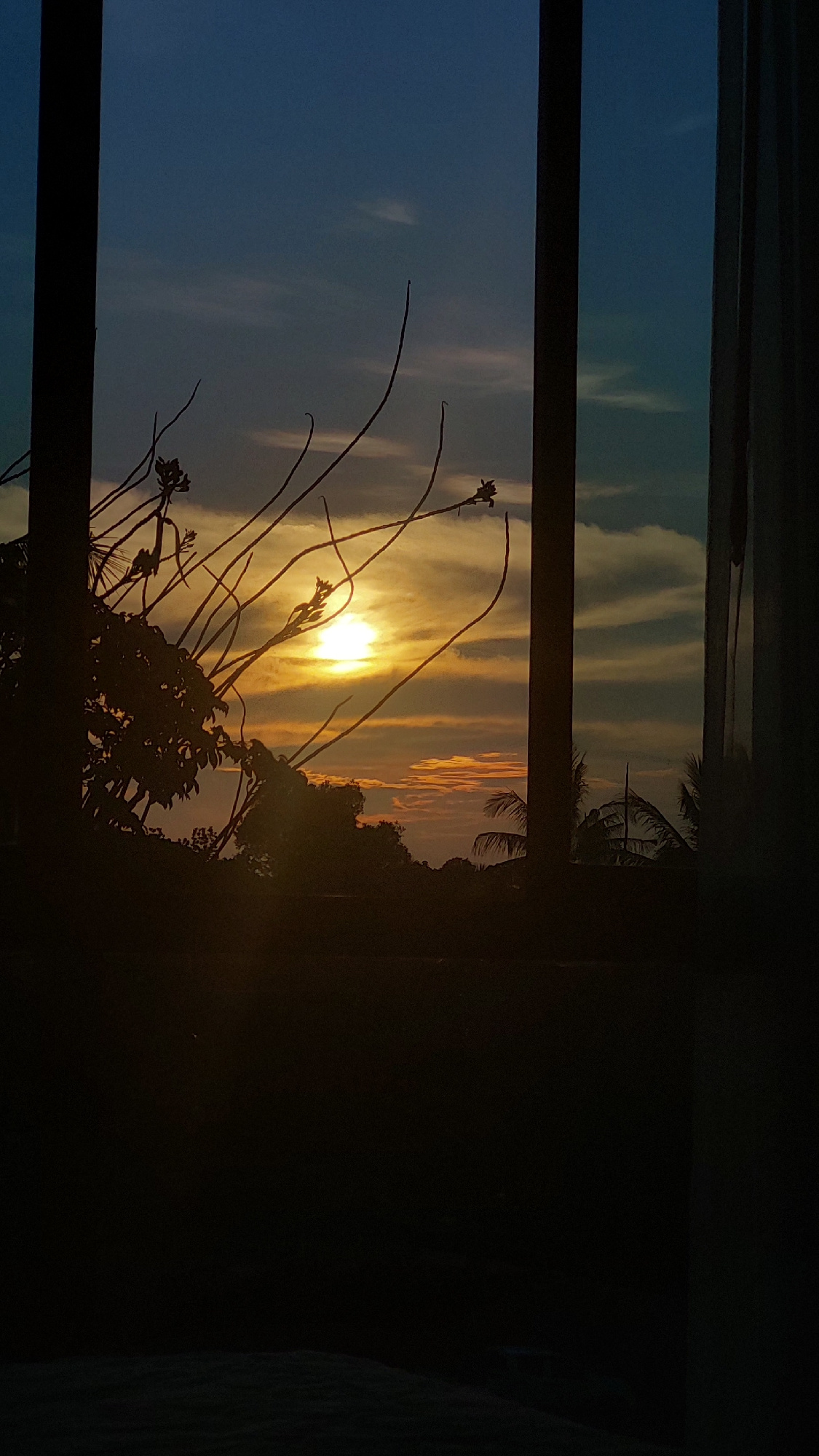 The image captures a vibrant sunset viewed through a window, oriented as if looking out from an interior space. The window frame, appearing as dark horizontal and vertical bars, divides the scene, wit…read more