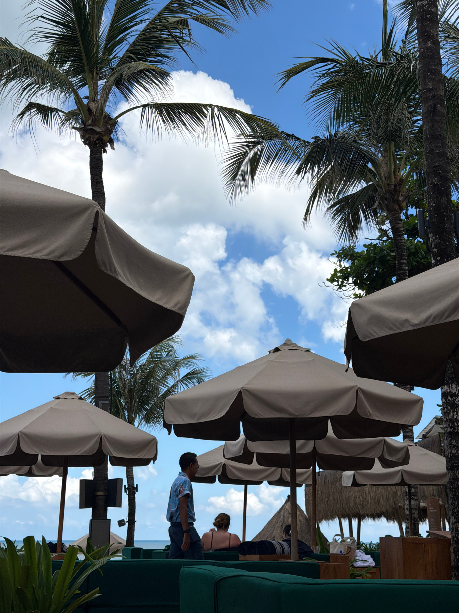 This outdoor scene in Kerobokan Kelod, Indonesia, features palm trees and several closed beach umbrellas. A blue sky with scattered clouds is visible between the trees and umbrellas. Two people are si…read more