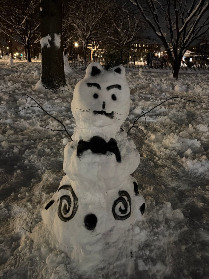 The image captures a whimsical snowman at night, illuminated by ambient light. The snowman is built in three sections, with a distinct character-like appearance rather than a traditional round shape.…read more