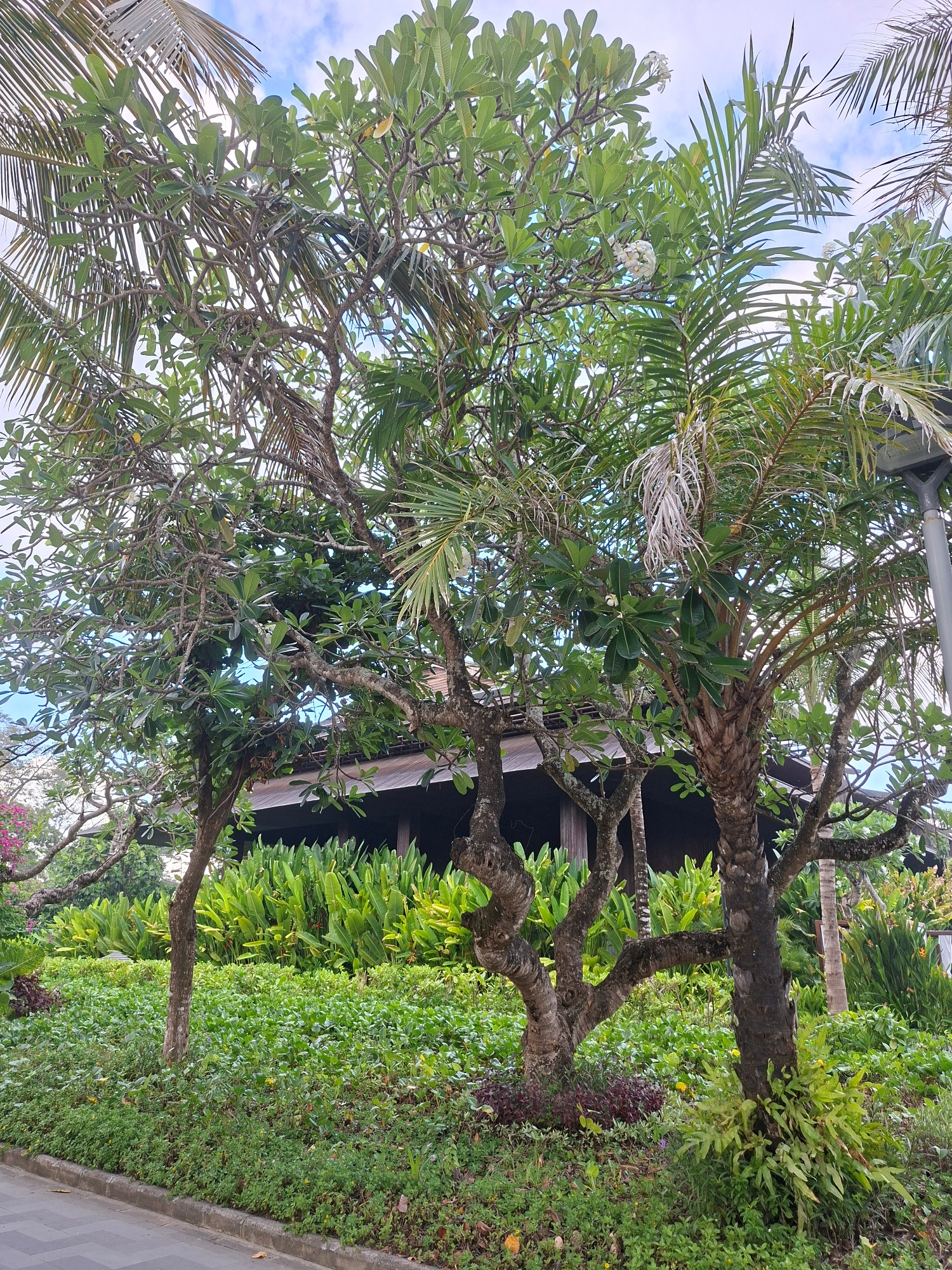 The image shows a garden scene in Denpasar, Indonesia. Two trees dominate the foreground, with a frangipani tree on the left and a palm tree on the right. Both trees have mature, branching trunks and…read more