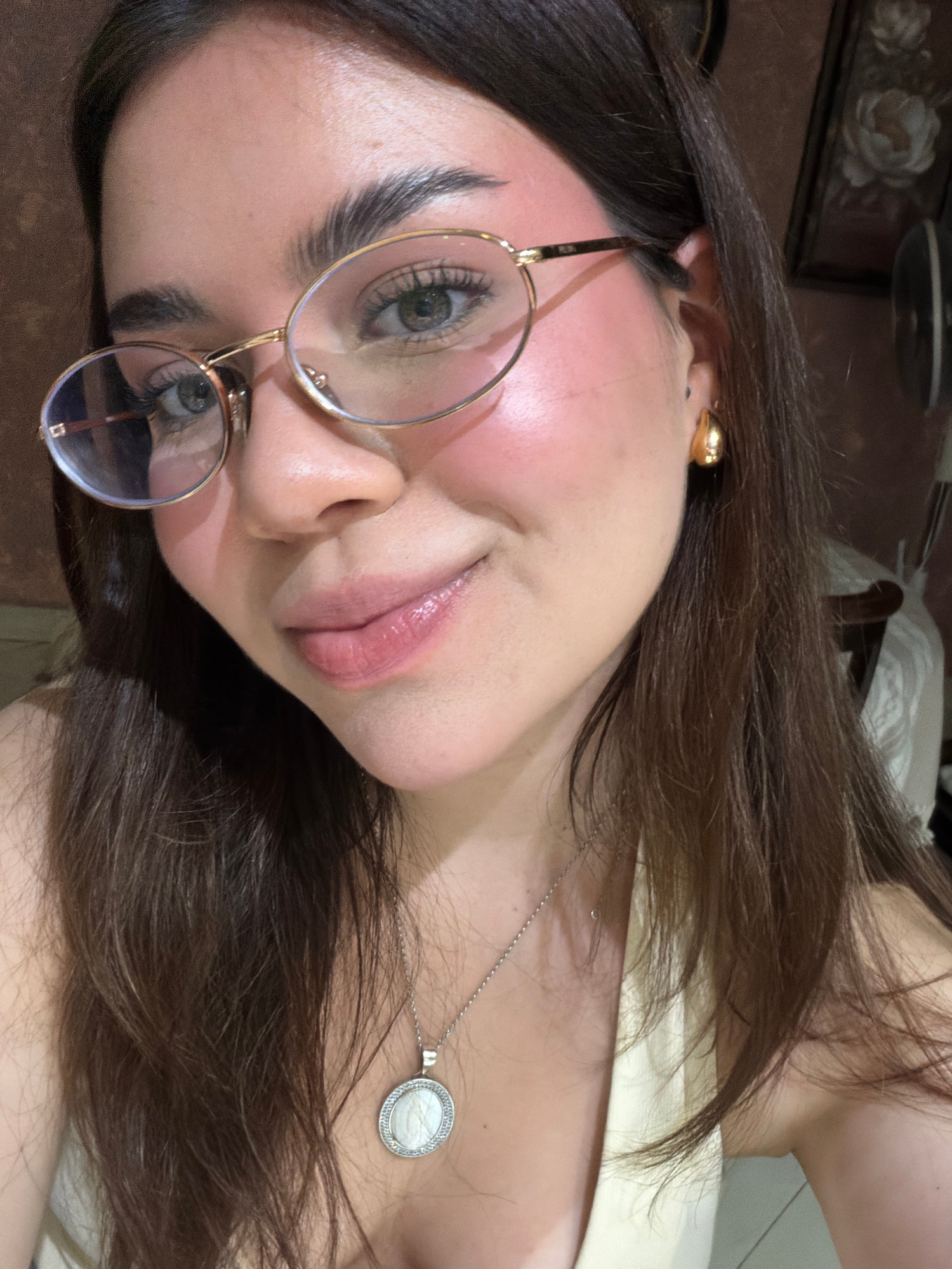 A close-up, tilted shot depicts a woman with brown hair. She is wearing round, gold-rimmed glasses. She has fair skin, defined eyebrows, and a necklace with a circular pendant. One ear is visible, ado…read more
