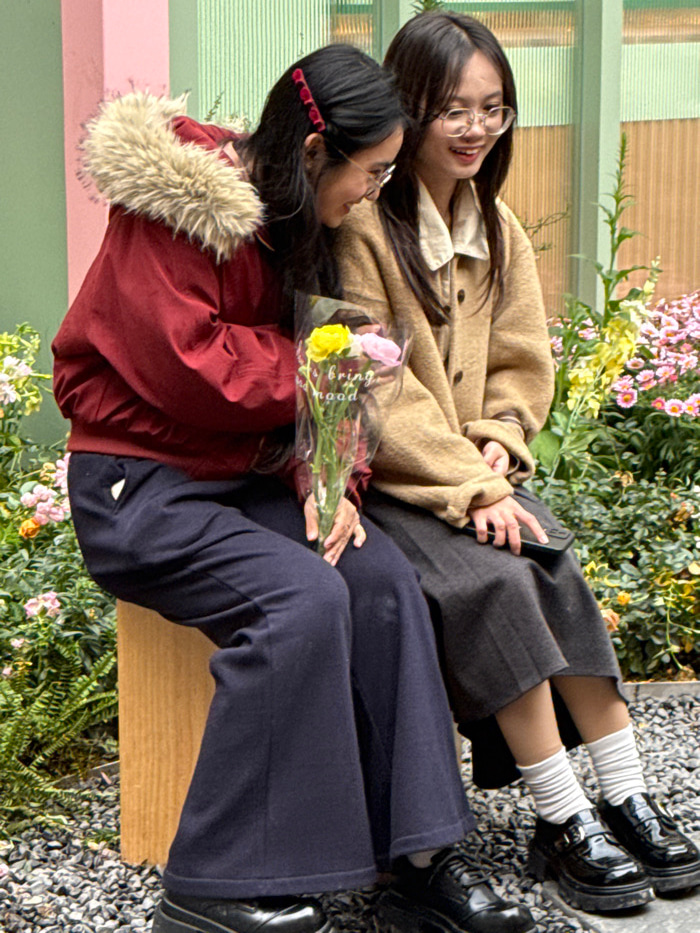 Two young East Asian females are seated on a light brown wooden block in what appears to be an outdoor environment in Liangjiang, China. The female on the left is wearing a dark red bomber jacket with…read more