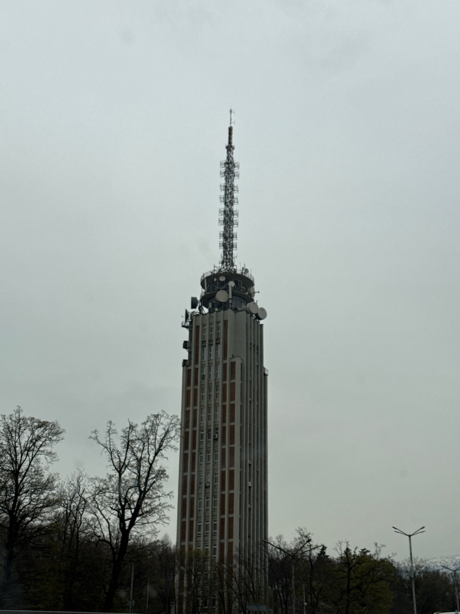 The image depicts the Sofia TV Tower in Bulgaria on a cloudy day. The tower is a tall, cylindrical structure with a lattice-like antenna extending from the top. The main body of the tower appears to b…read more