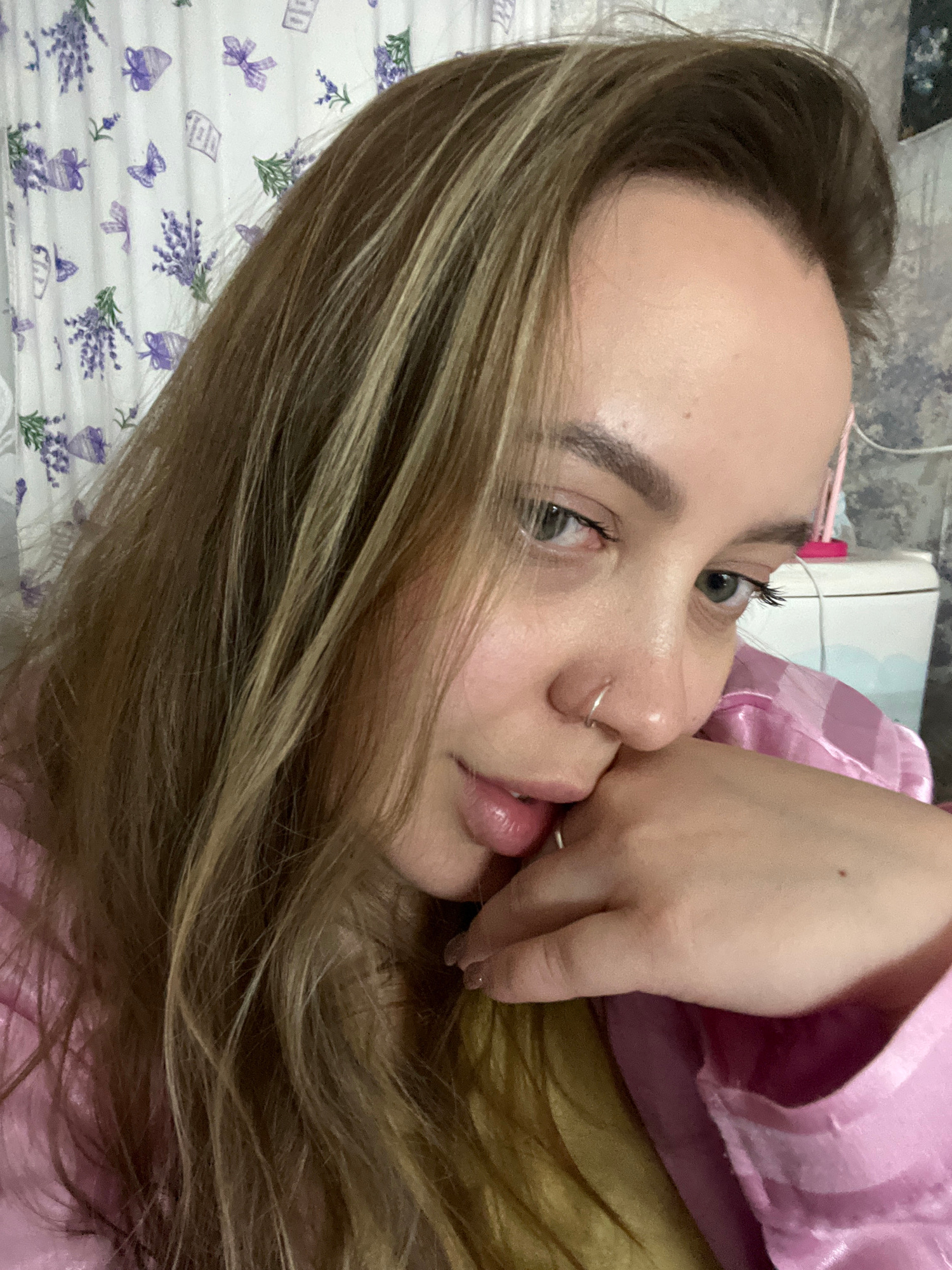 A person lies on a bed, posing for a selfie. The individual has light brown hair with blonde highlights, fair skin, and a nose ring. They are wearing a pink satin top. Their hand is near their mouth,…read more