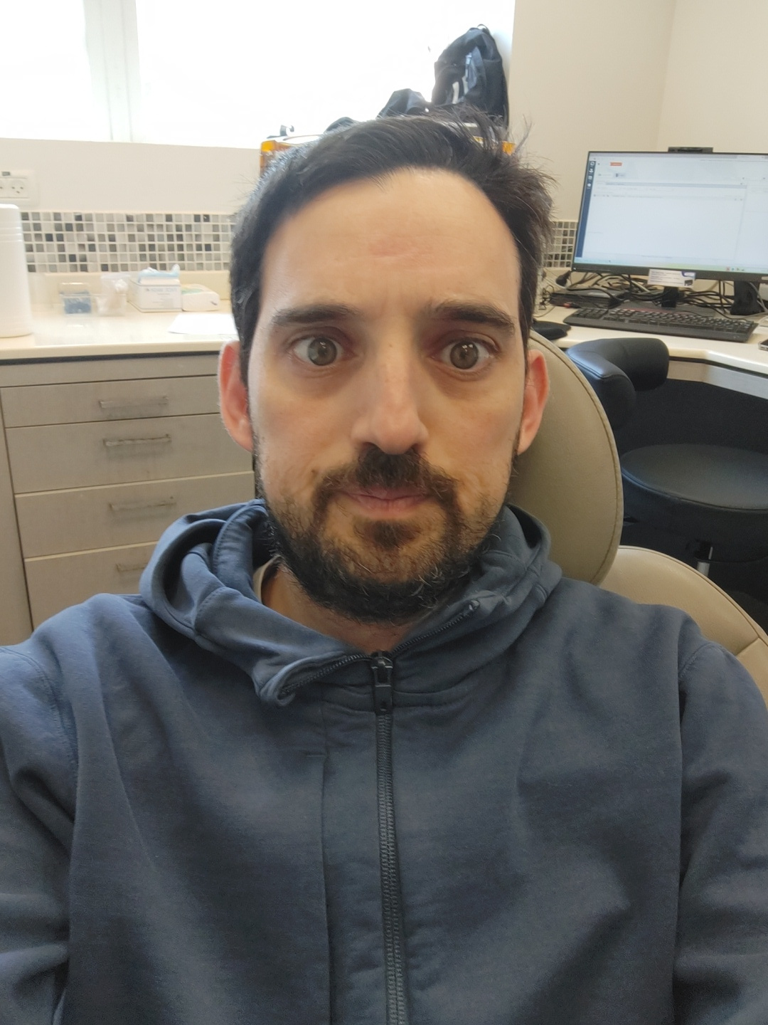 A man with dark hair and a trimmed beard, wearing a blue hooded sweatshirt, is sitting in an office. A computer monitor and keyboard are visible on a desk in front of him. Behind him is a file cabinetβ¦read more
