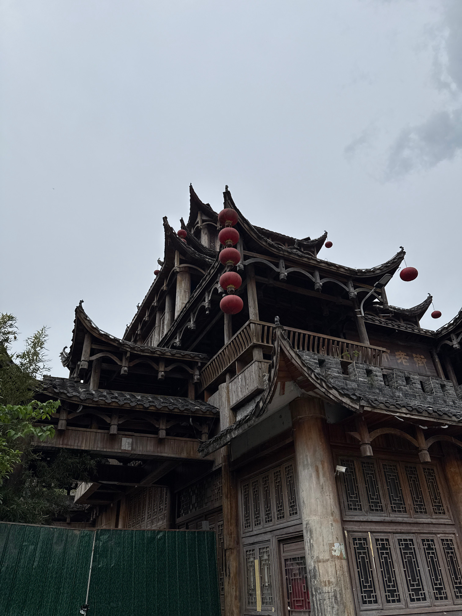 An upward-angle shot captures a multi-tiered traditional Chinese wooden building against a uniformly overcast, light gray sky. The building, likely a grand hall or a complex structure, features multip…read more