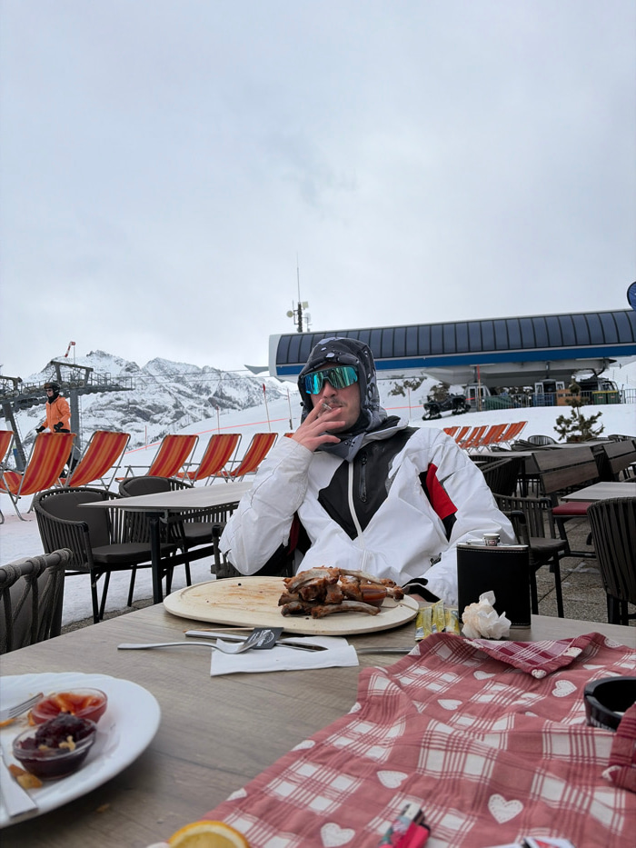 An outdoor scene in a snow-covered mountainous area, identified as Finkenberg, Austria, depicts a person seated at a wooden table in an open-air restaurant or cafe area. The individual, a male, is dre…read more