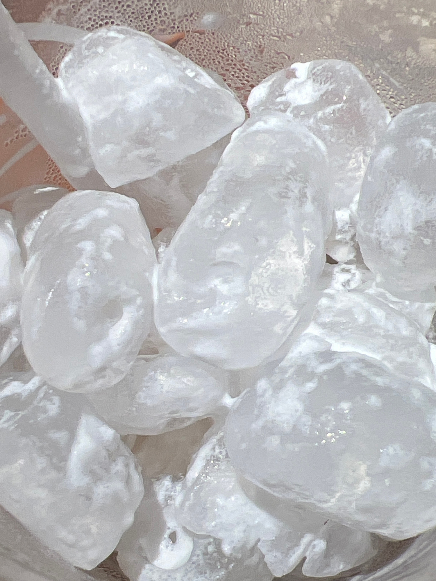 The image shows a close-up view of ice cubes in a clear plastic container. The ice cubes are of varying sizes and shapes, with some appearing angular and others more rounded. There is condensation vis…read more
