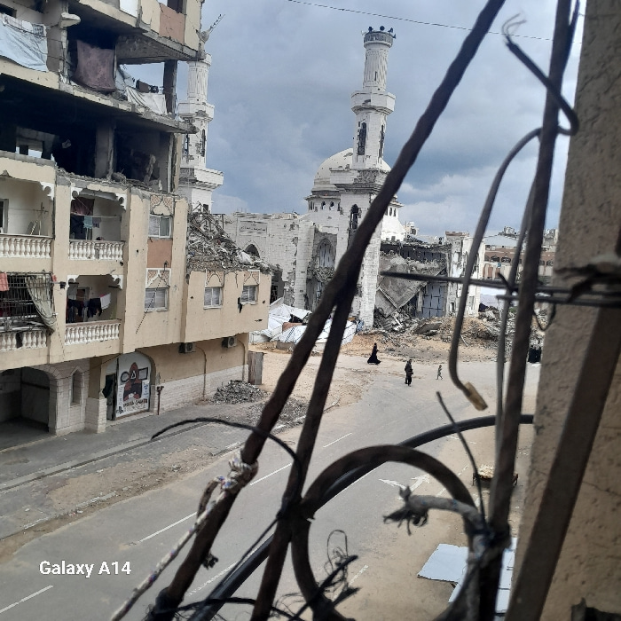 An aerial perspective photograph captured in Khan Yunis, Palestinian Territory, depicts a street scene characterized by extensive structural damage under an overcast sky. In the immediate foreground,…read more