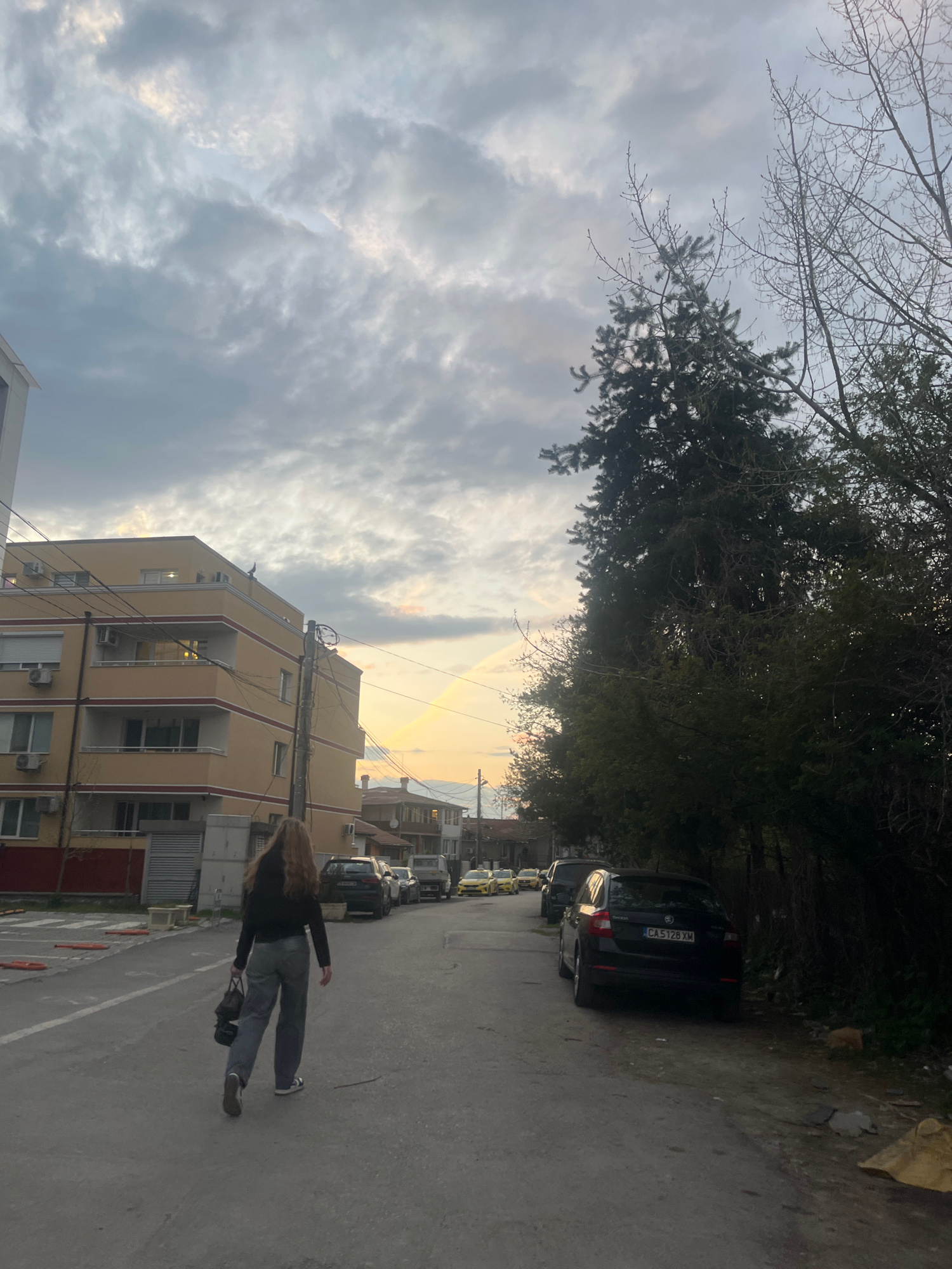 The image displays an outdoor street scene in Sofia, Bulgaria, captured during either sunrise or sunset, evidenced by the soft, golden light breaking through an overcast sky. A person with long, light…read more