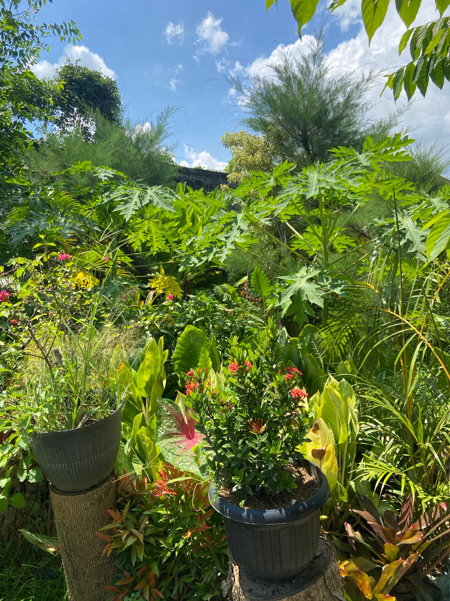 The image depicts a lush garden in Buleleng, Indonesia, with a vibrant mix of tropical plants. The scene features a variety of greenery, including papaya trees with large, distinctive leaves, feathery tamarisk trees, and other unidentified shrubs and flowering plants. There are also potted plants placed on tree trunks. The sky, visible through the canopy, is blue with scattered white clouds. The overall environment suggests a warm, humid climate. | Open Wire
